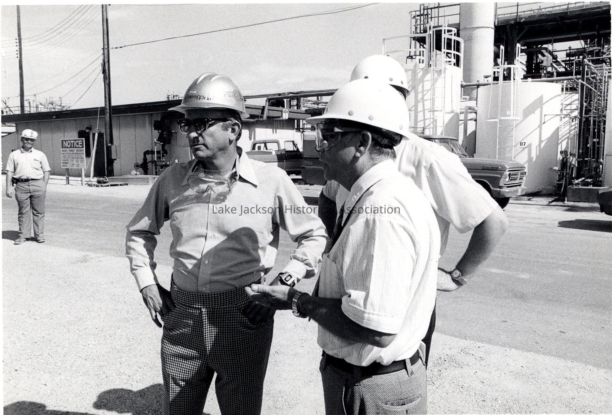 Black and white photo of President Paul Oreffice touring the Proplene Oxide plant at Dow.Collection