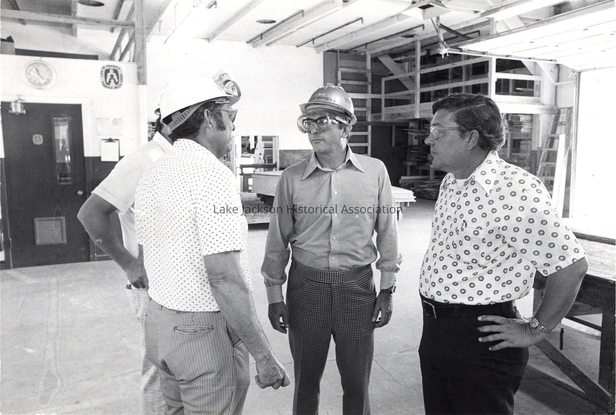 Black and white photo of President Paul Oreffice having a conversation with Dow employees while touring the Proplene Oxide plant at Dow.Collection