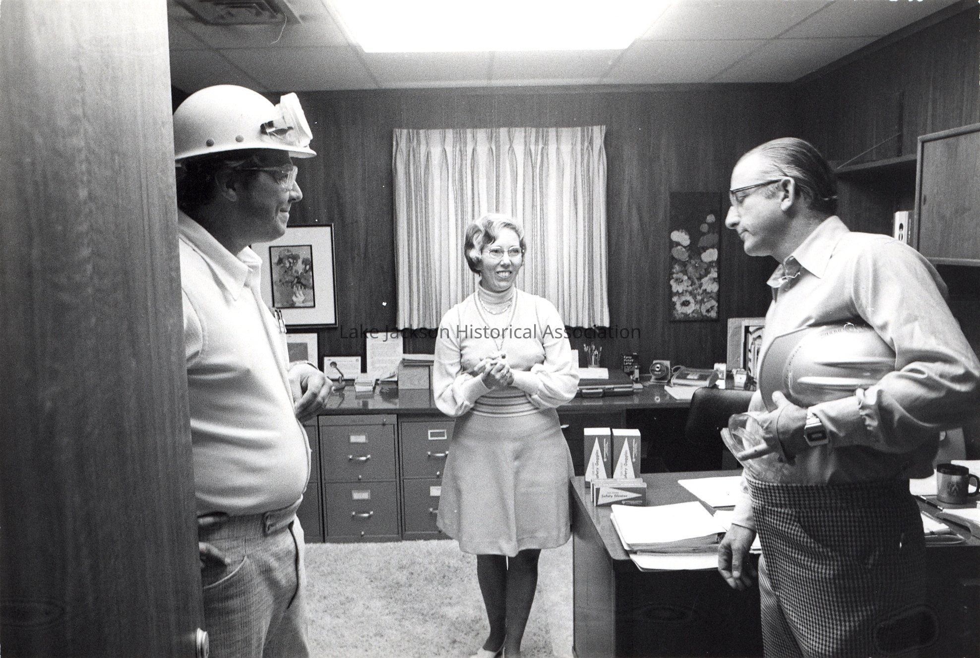 Black and white photo of President Paul Oreffice visiting a receptionist in her office while touring the Proplene Oxide plant at Dow.Collection