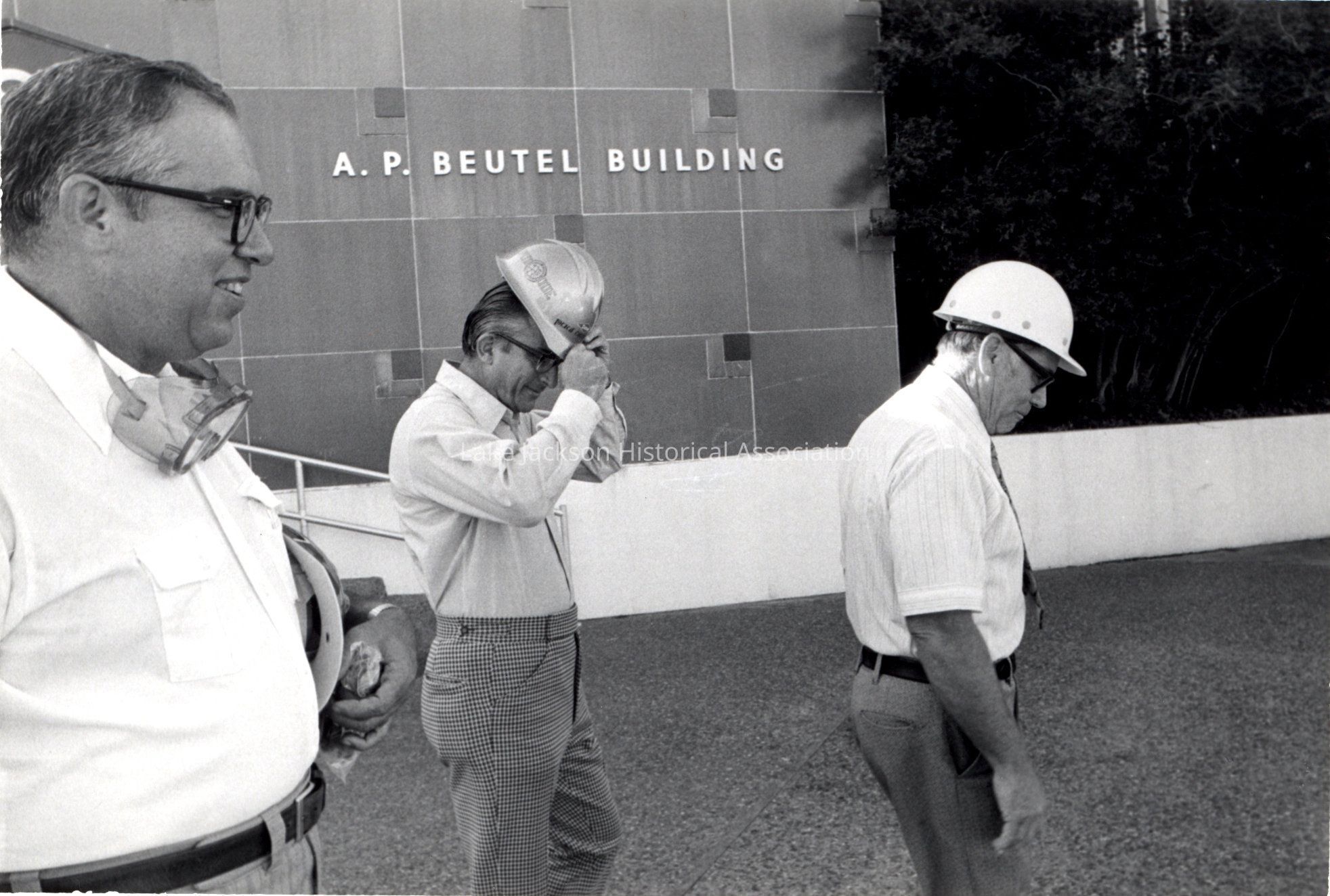 Black and white photo of President Paul Oreffice out side of the A.P. Beutel building while touring the Propylene Oxide plant at Dow.Collection