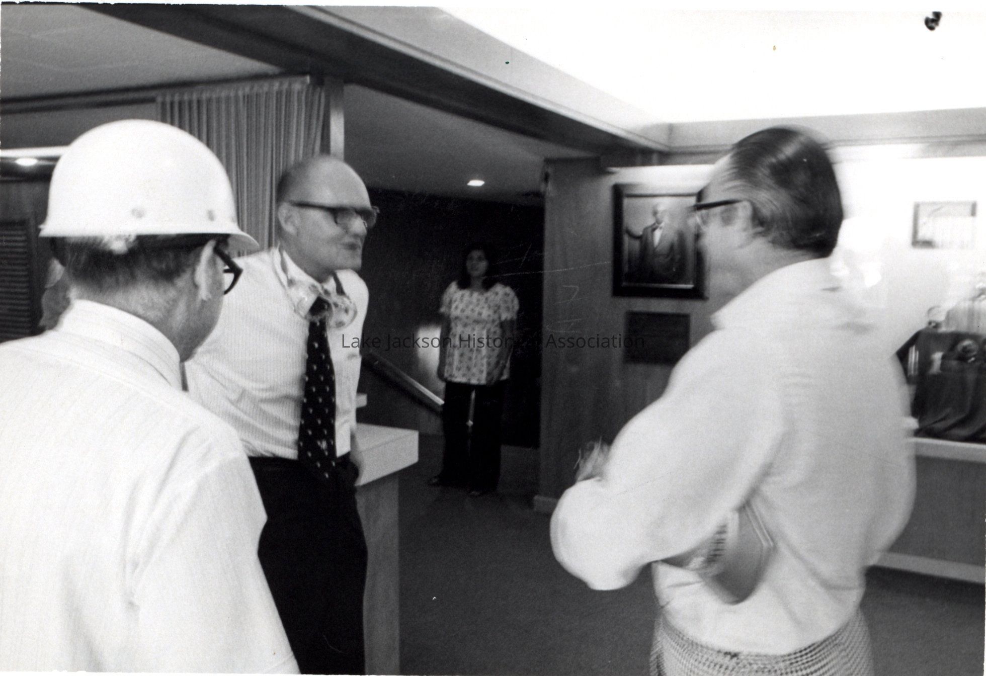 Black and white photo of President Paul Oreffice having a conversation iwth a few employees while touring the Propylene Oxide plant at Dow.Collection