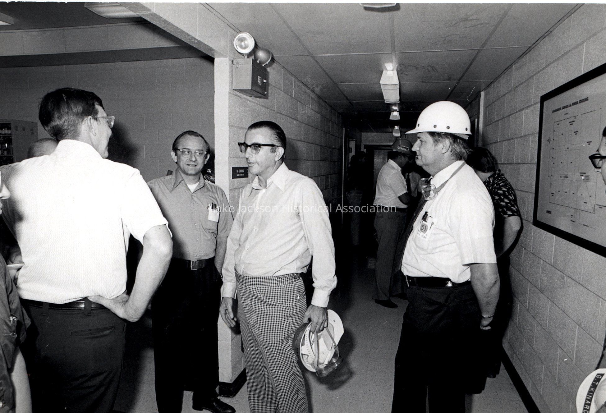 Black and white photo of President Paul Oreffice talking with employees in a hallway while touring the Propylene Oxide plant at Dow.Collection