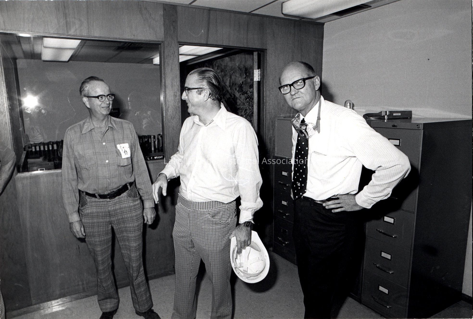 Black and white photo of President Paul Oreffice talks with two employees while touring the Propylene Oxide plant at Dow.Collection