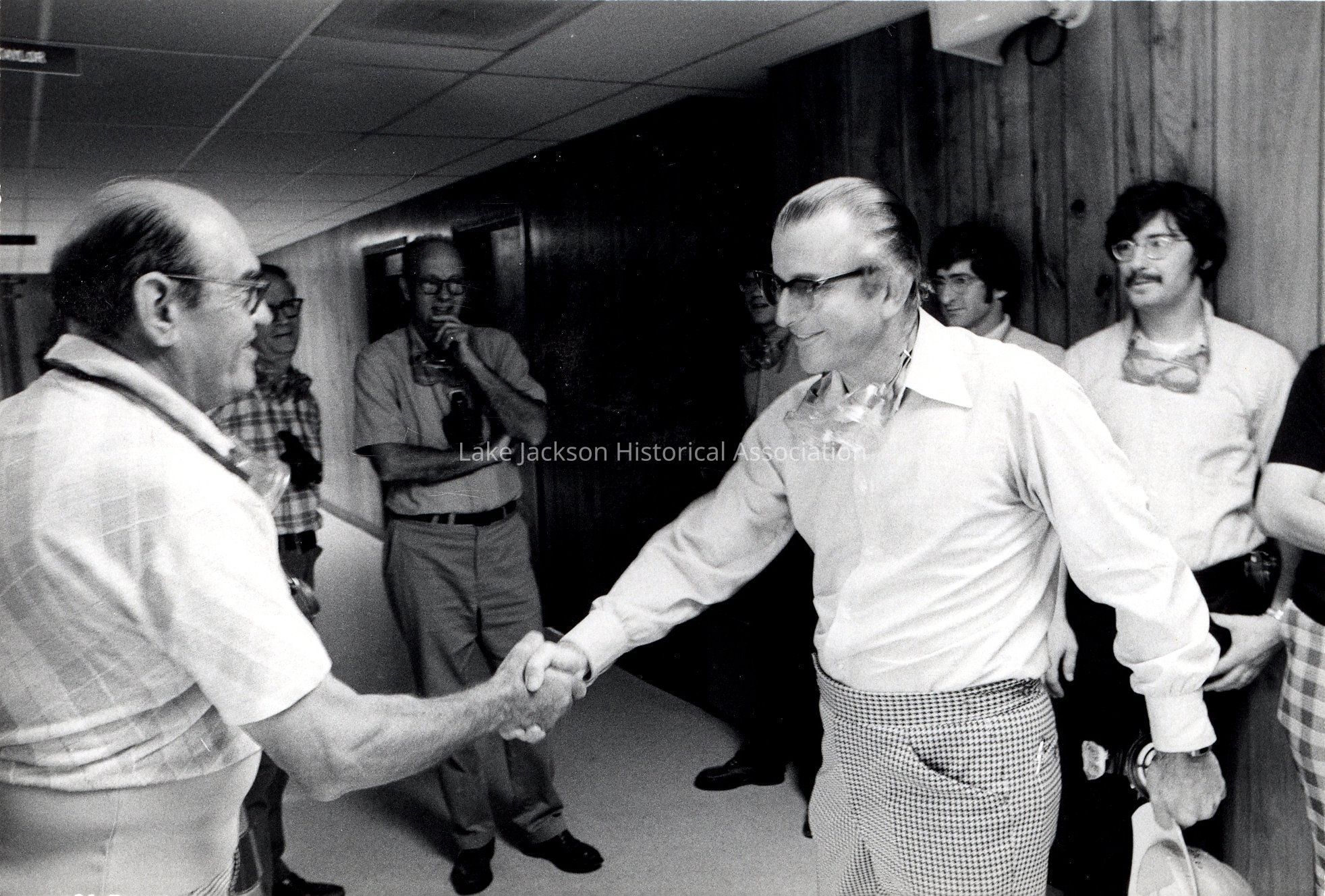 Black and white photo of President Paul Oreffice shaking hands with an employee in a room of people while touring the Propylene Oxide plant at Dow.Collection