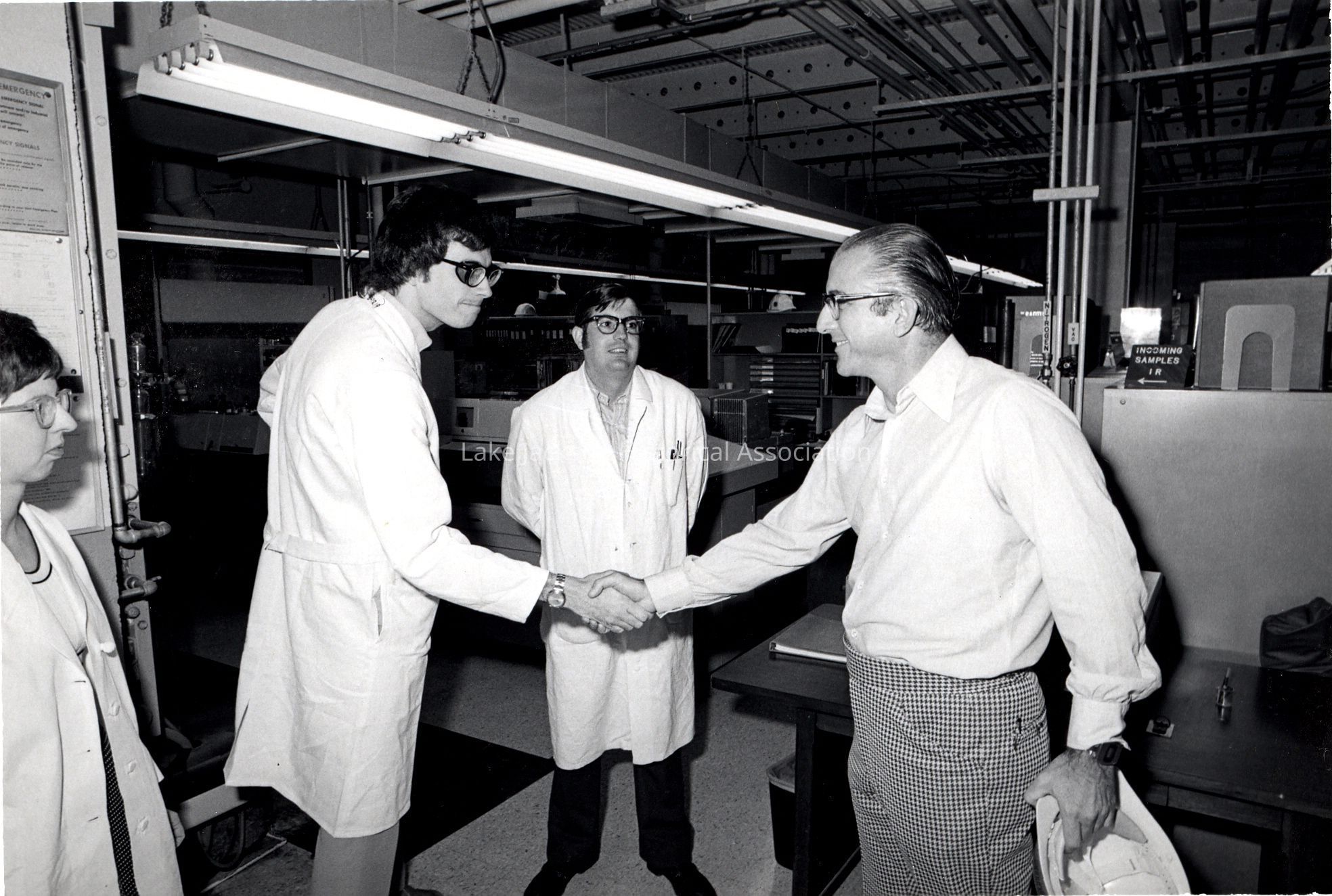 Black and white photo of President Paul Oreffice shaking hands with an employee while touring the Propylene Oxide plant at Dow. All the employees in this picture are wearing lab coats.Collection