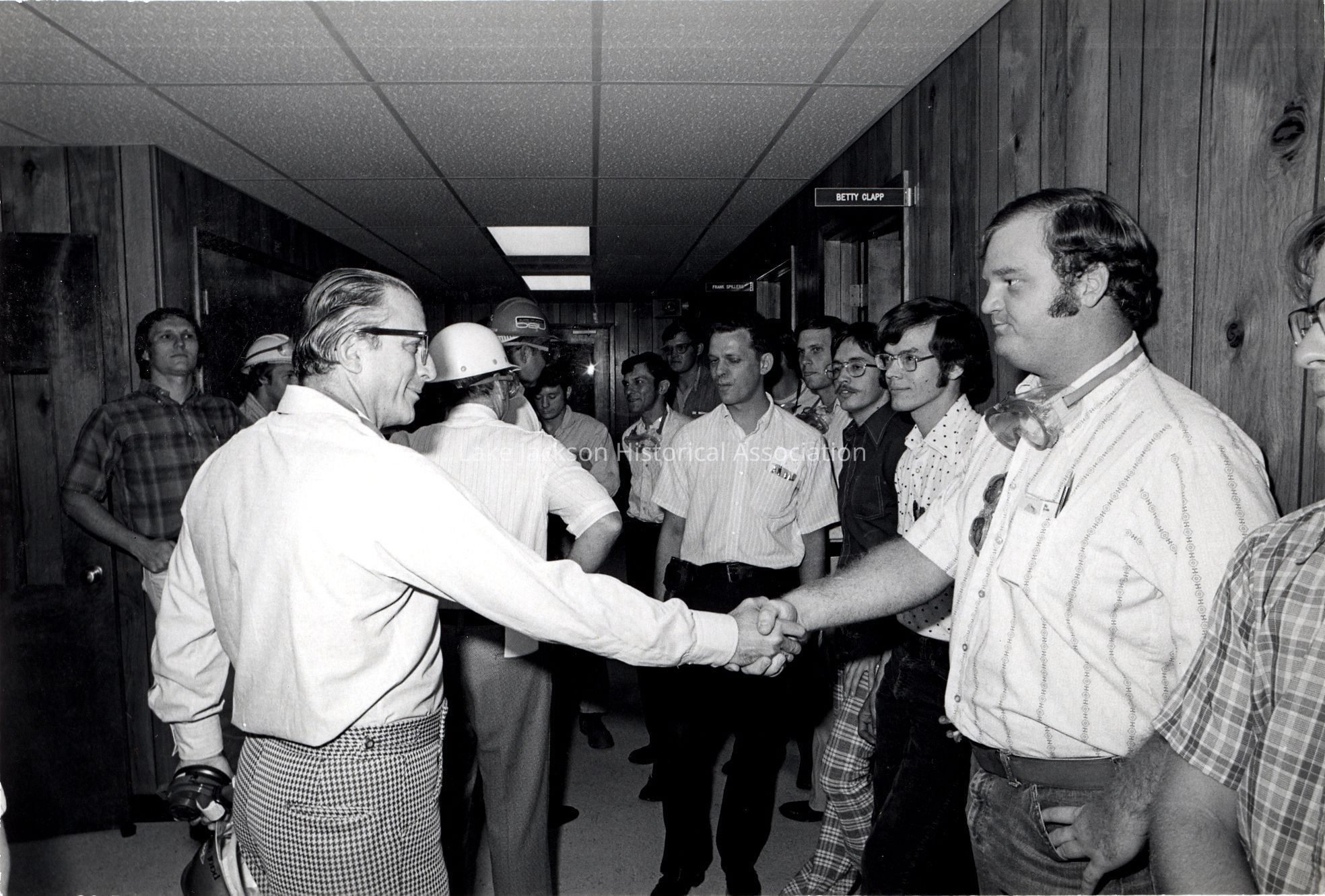Black and white photo of President Paul Oreffice shaking hands with an employee in a hall full of people while touring the Propylene Oxide plant at Dow.Collection
