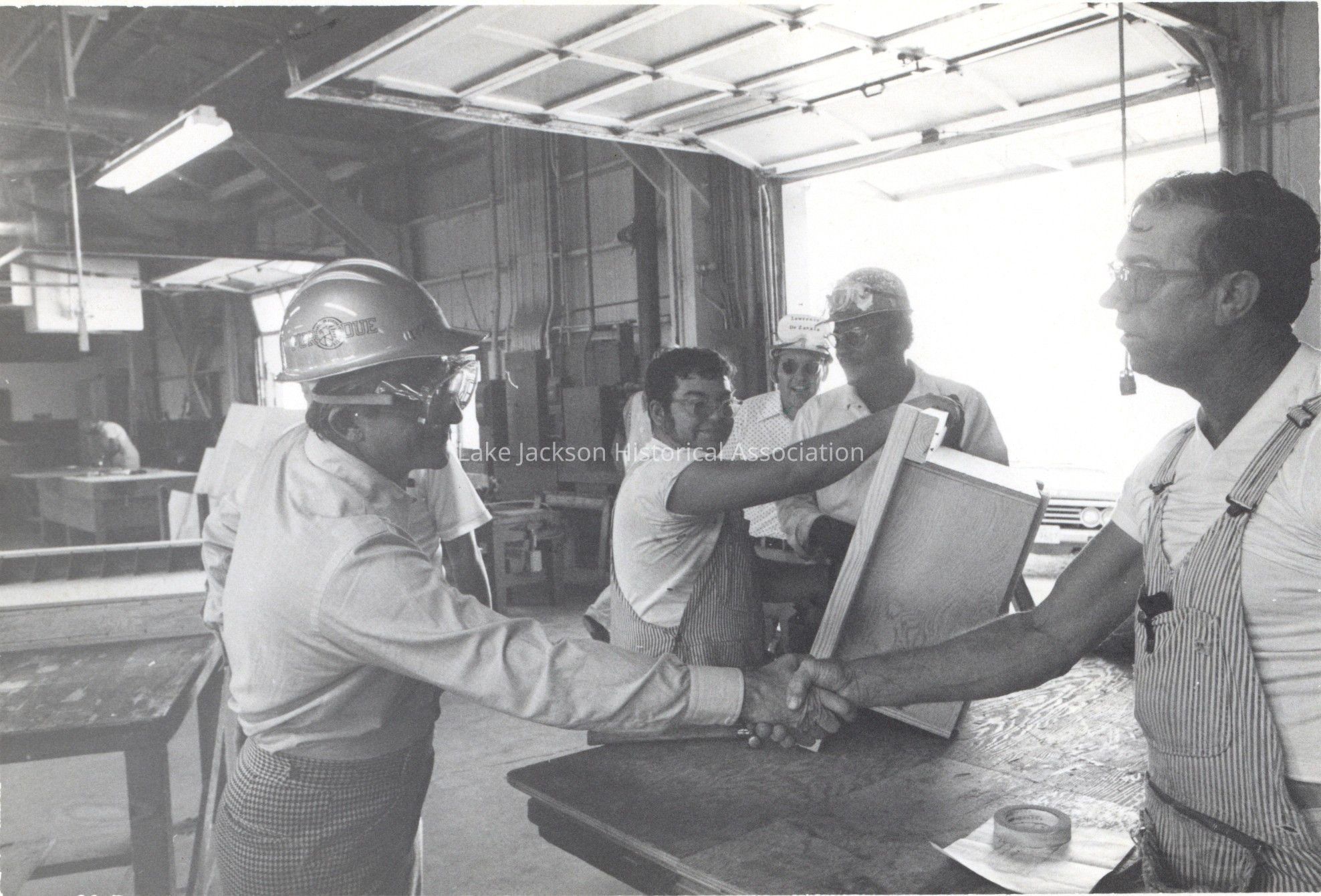 Black and white photo of President Paul Oreffice shaking hands with an employee in a warehouse while touring the Propylene Oxide plant at Dow.Collection