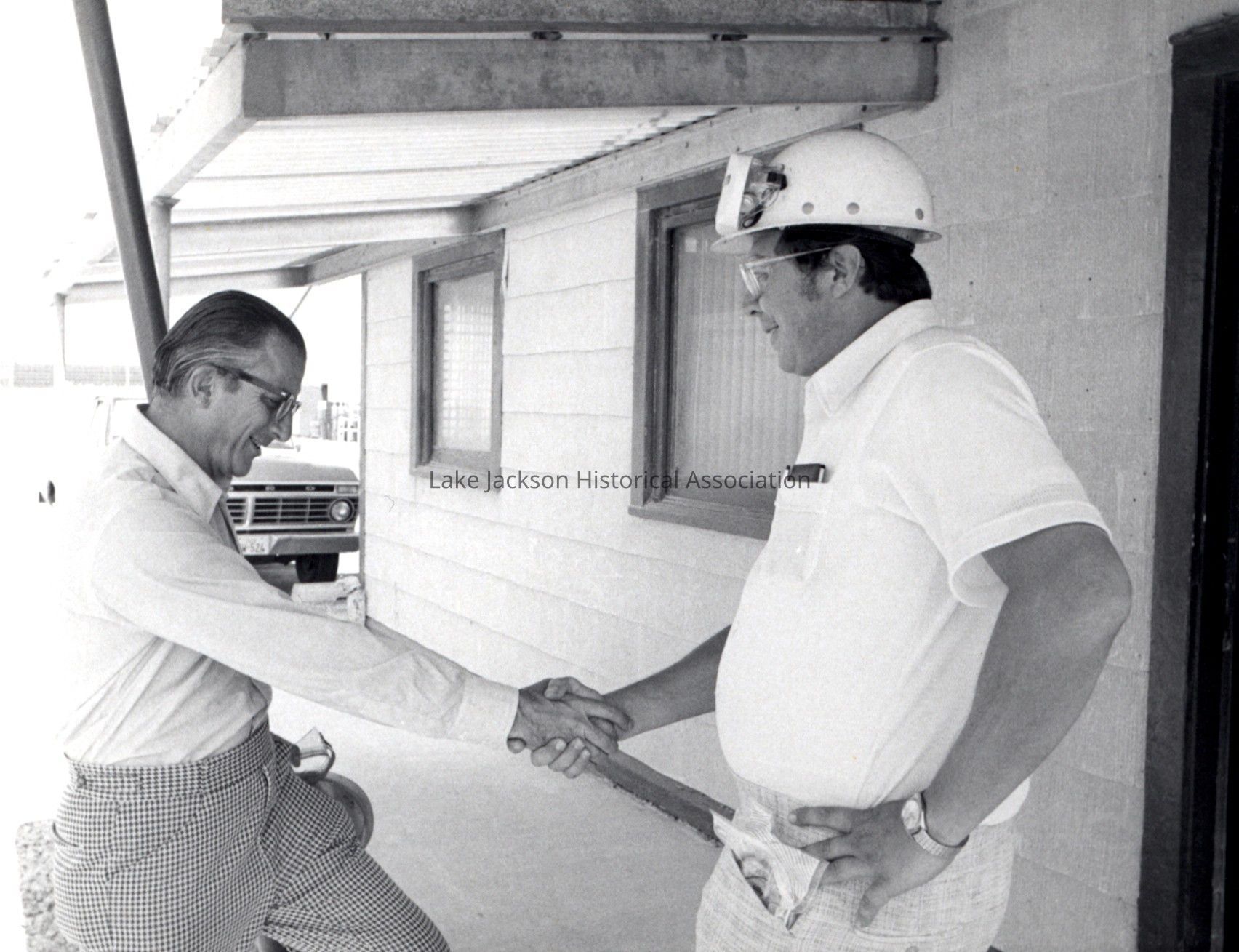 Black and white photo of President Paul Oreffice shaking hands with an employee out on the grounds while touring the Propylene Oxide plant at Dow.Collection