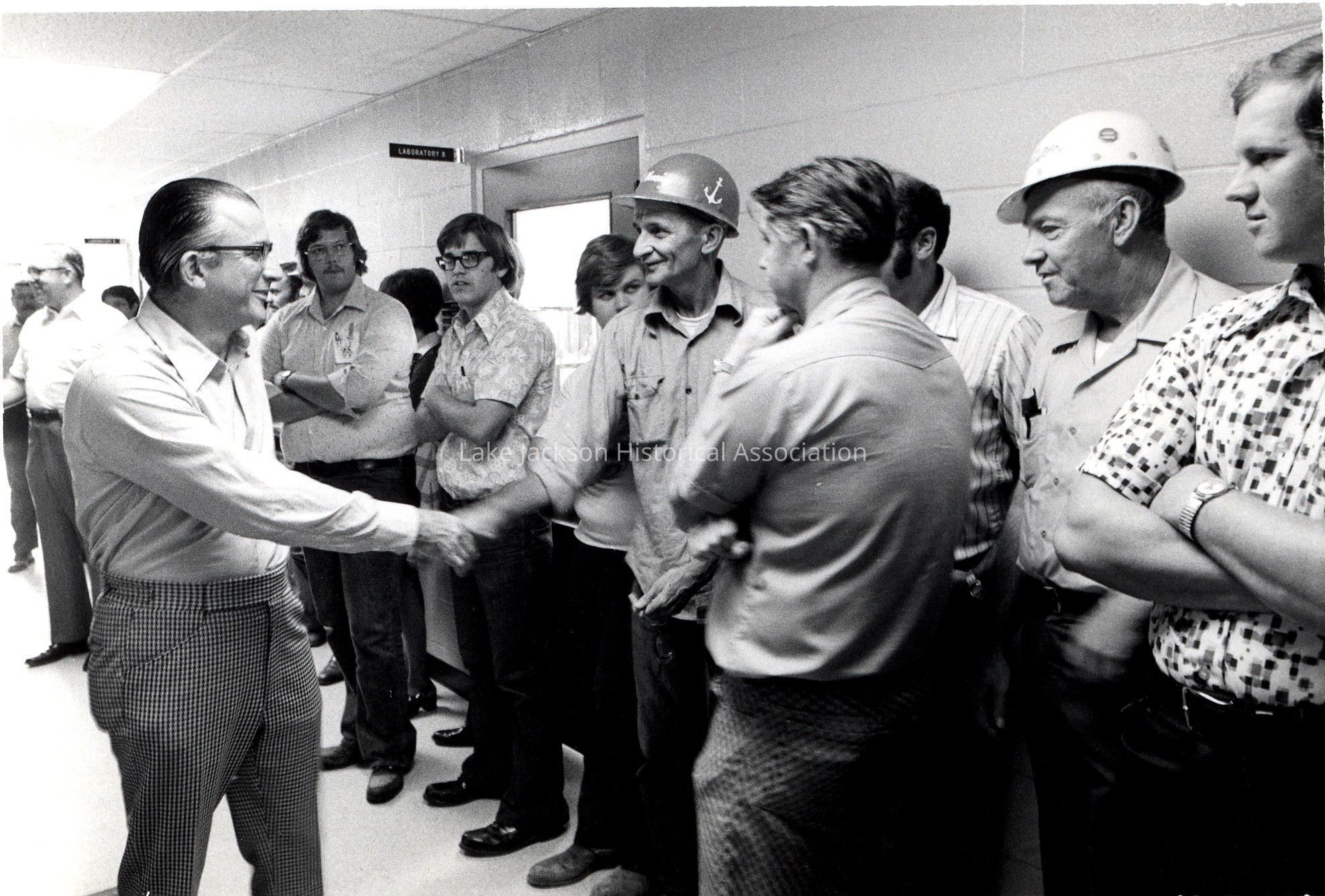 Black and white photo of President Paul Oreffice shaking hands with an employee in a hallway full of people while touring the Propylene Oxide plant at Dow.Collection