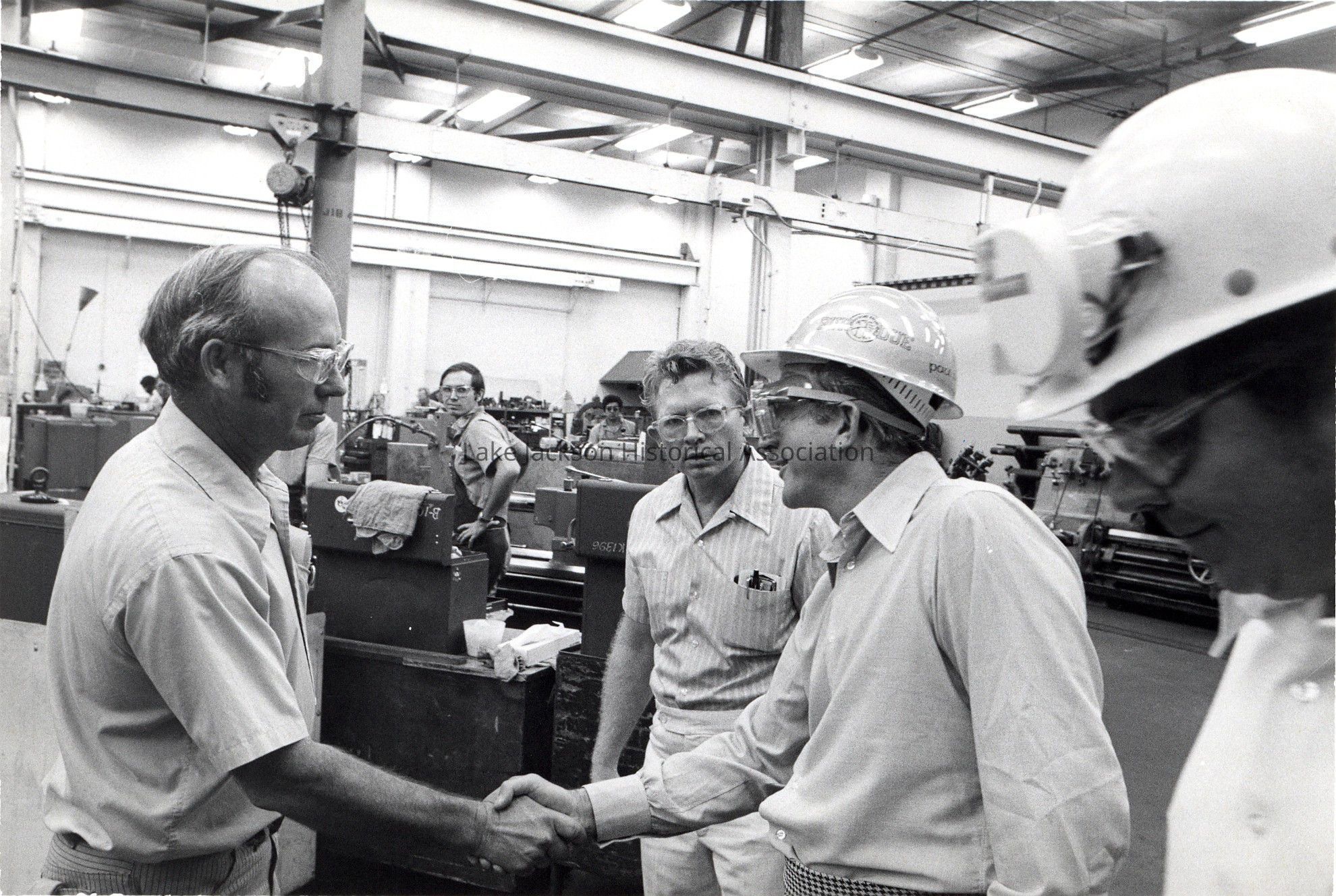Black and white photo of President Paul Oreffice shaking hands with an employee in a warehouse while touring the Propylene Oxide plant at Dow.Collection