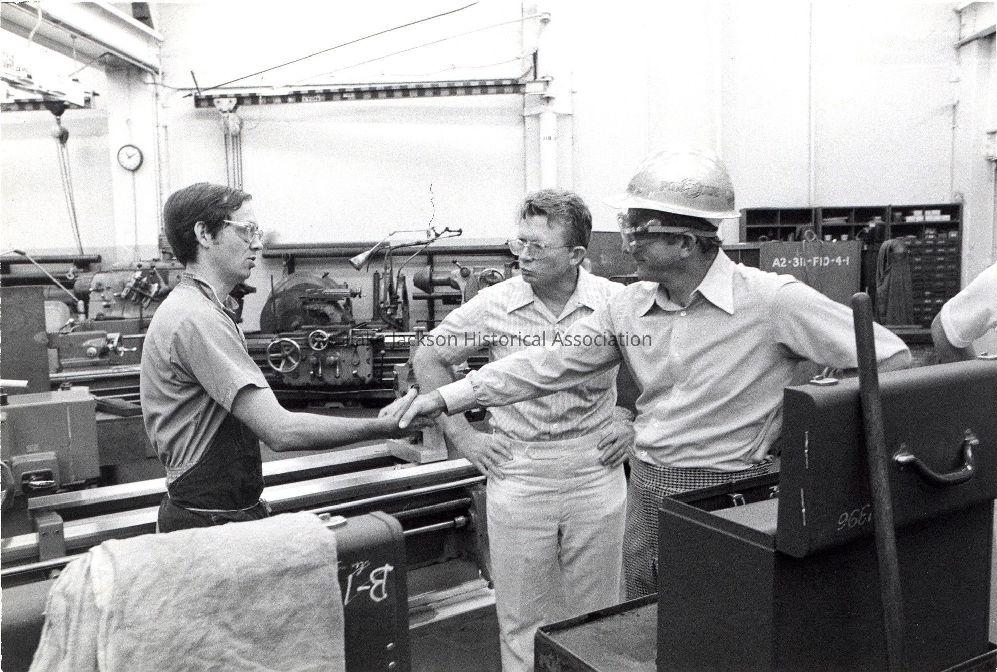 Black and white photo of President Paul Oreffice shaking hands with an employee in an industrial setting while touring the Propylene Oxide plant at Dow.Collection