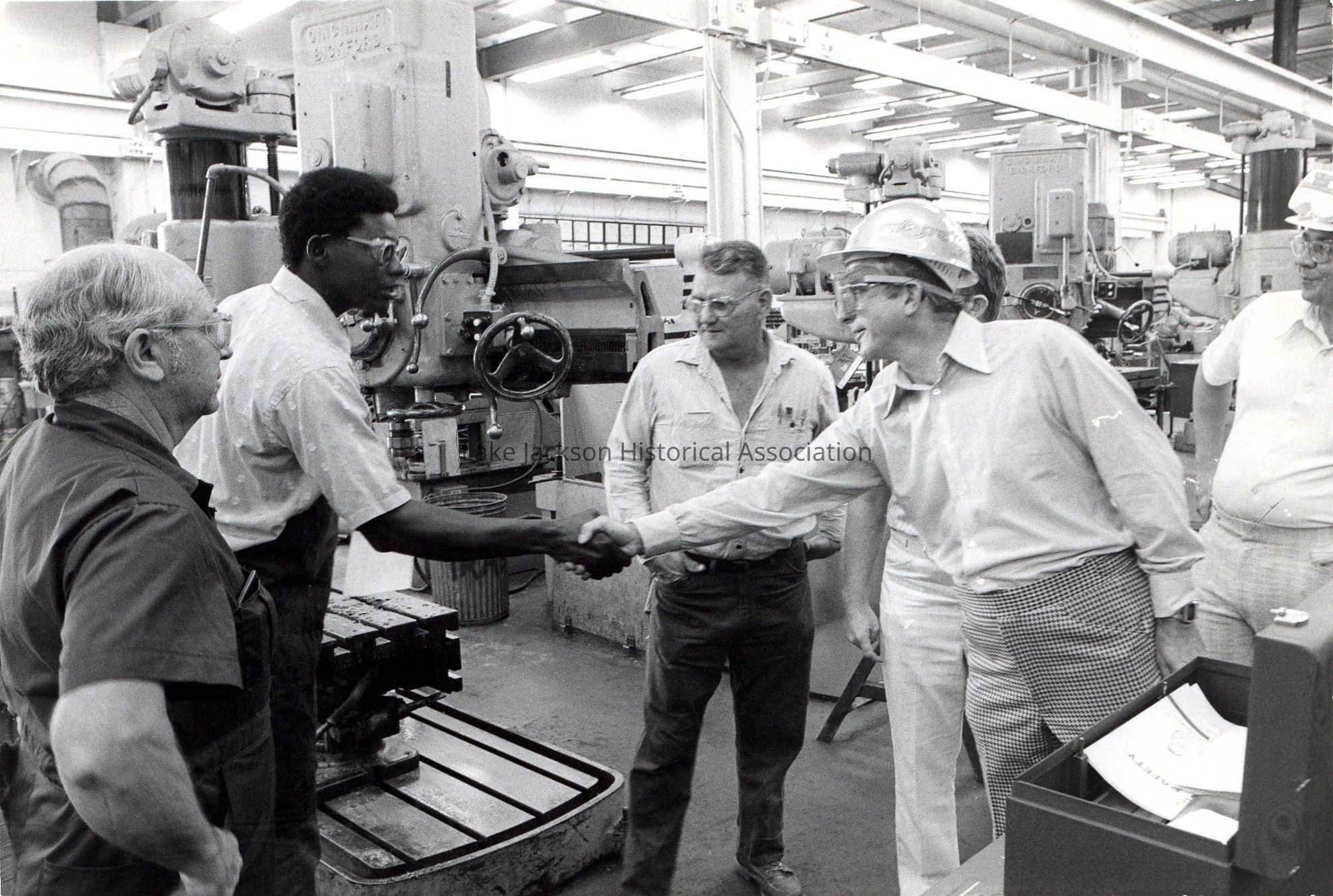 Black and white photo of President Paul Oreffice shaking hands with an African-AMerican employee in an industrial setting while touring the Propylene Oxide plant at Dow.Collection