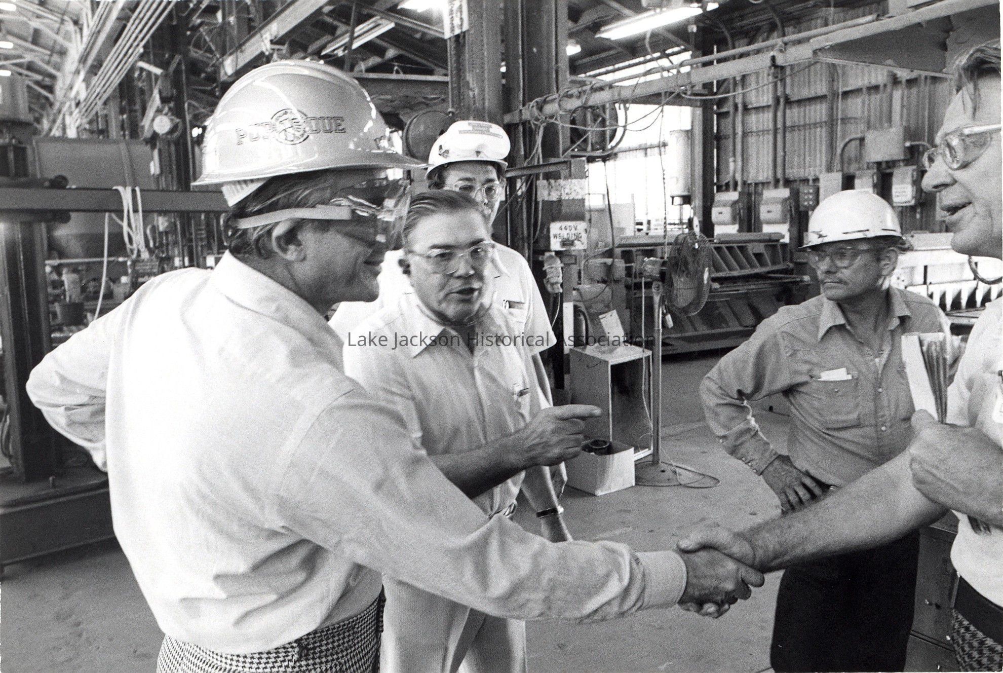 Black and white photo of President Paul Oreffice shaking hands with an employee in an industrial setting while touring the Propylene Oxide plant at Dow.Collection