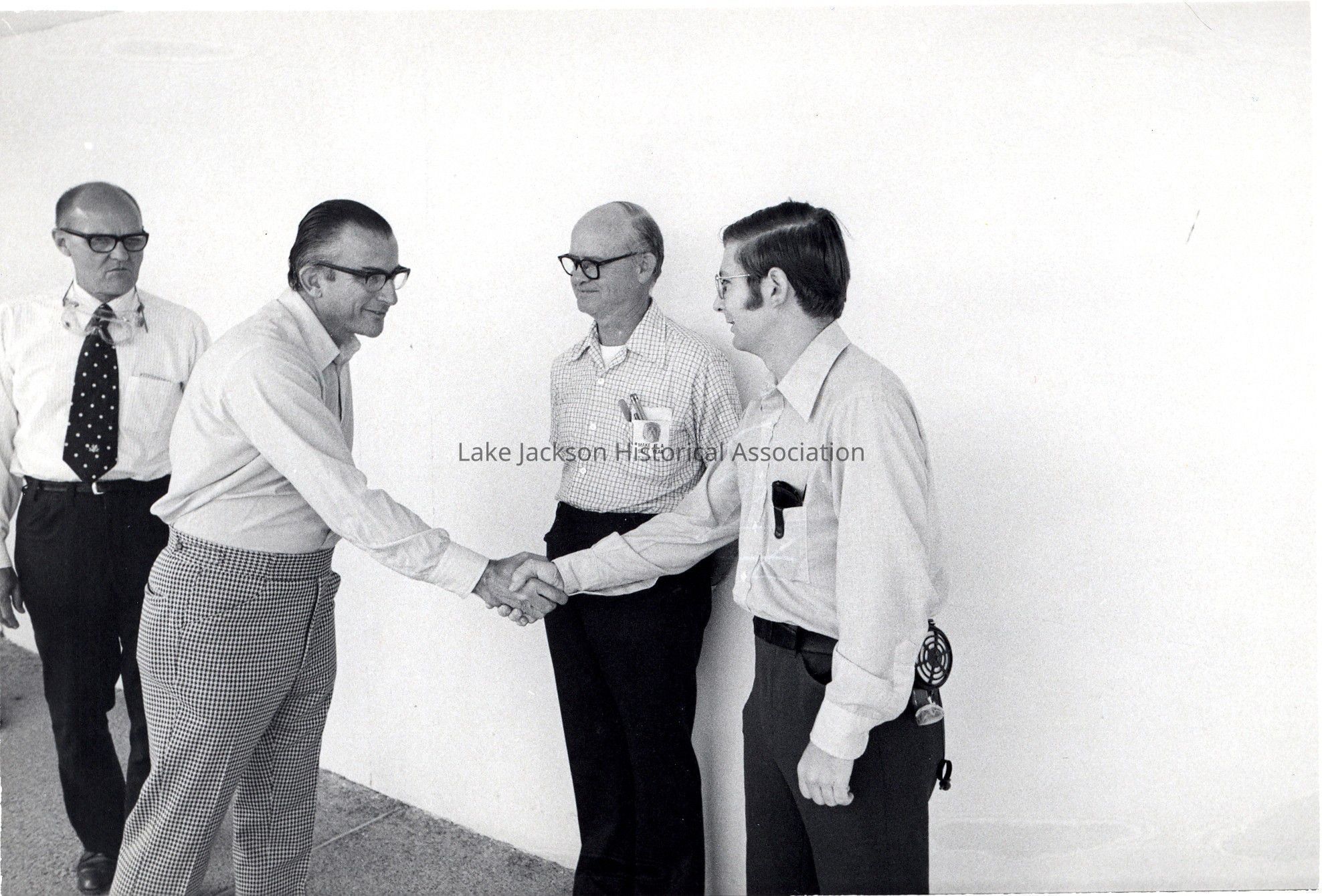 Black and white photo of President Paul Oreffice shaking hands with an employee while touring the Propylene Oxide plant at Dow.Collection