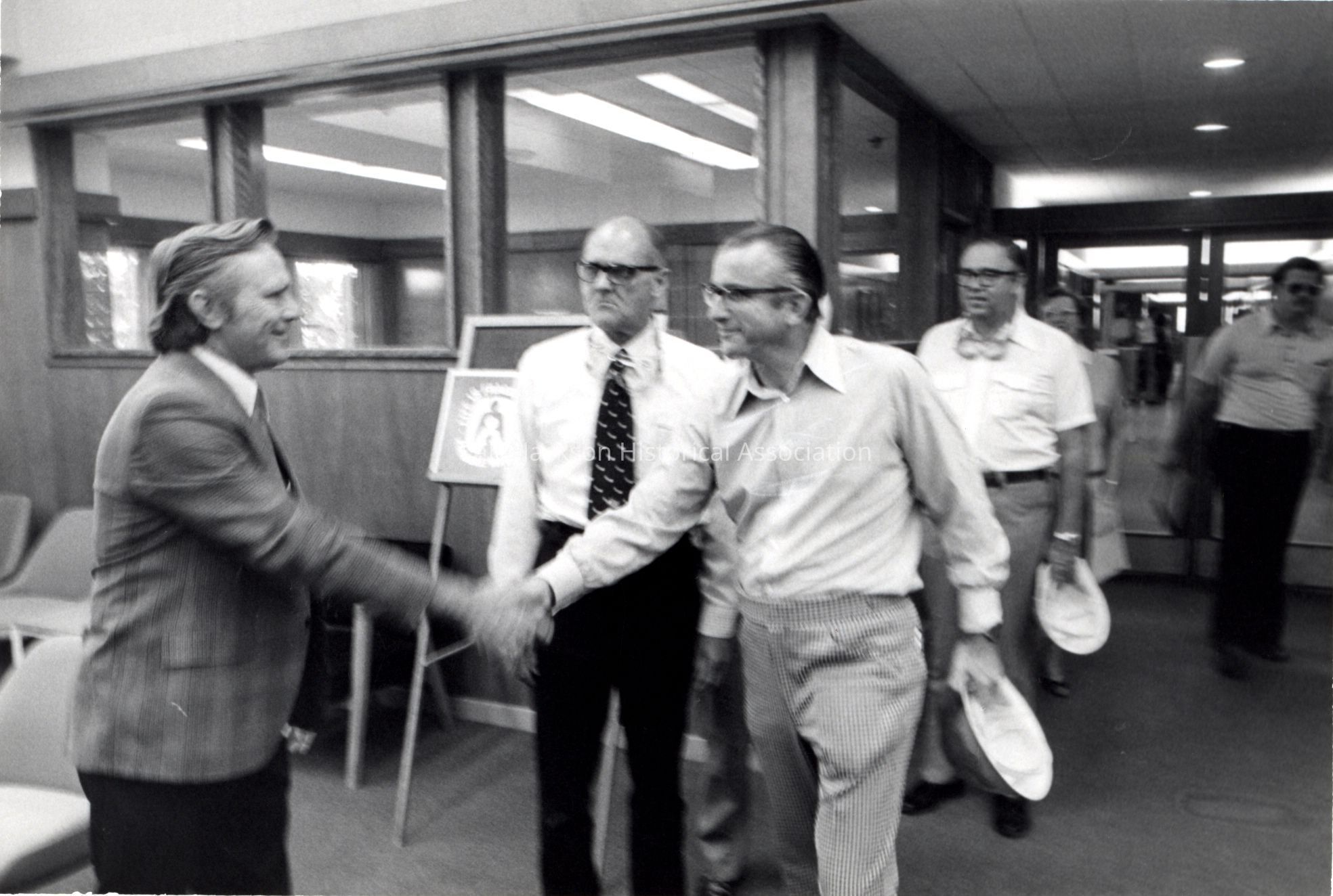 Black and white photo of President Paul Oreffice shaking hands with an employee in a reception area while touring the Propylene Oxide plant at Dow.Collection