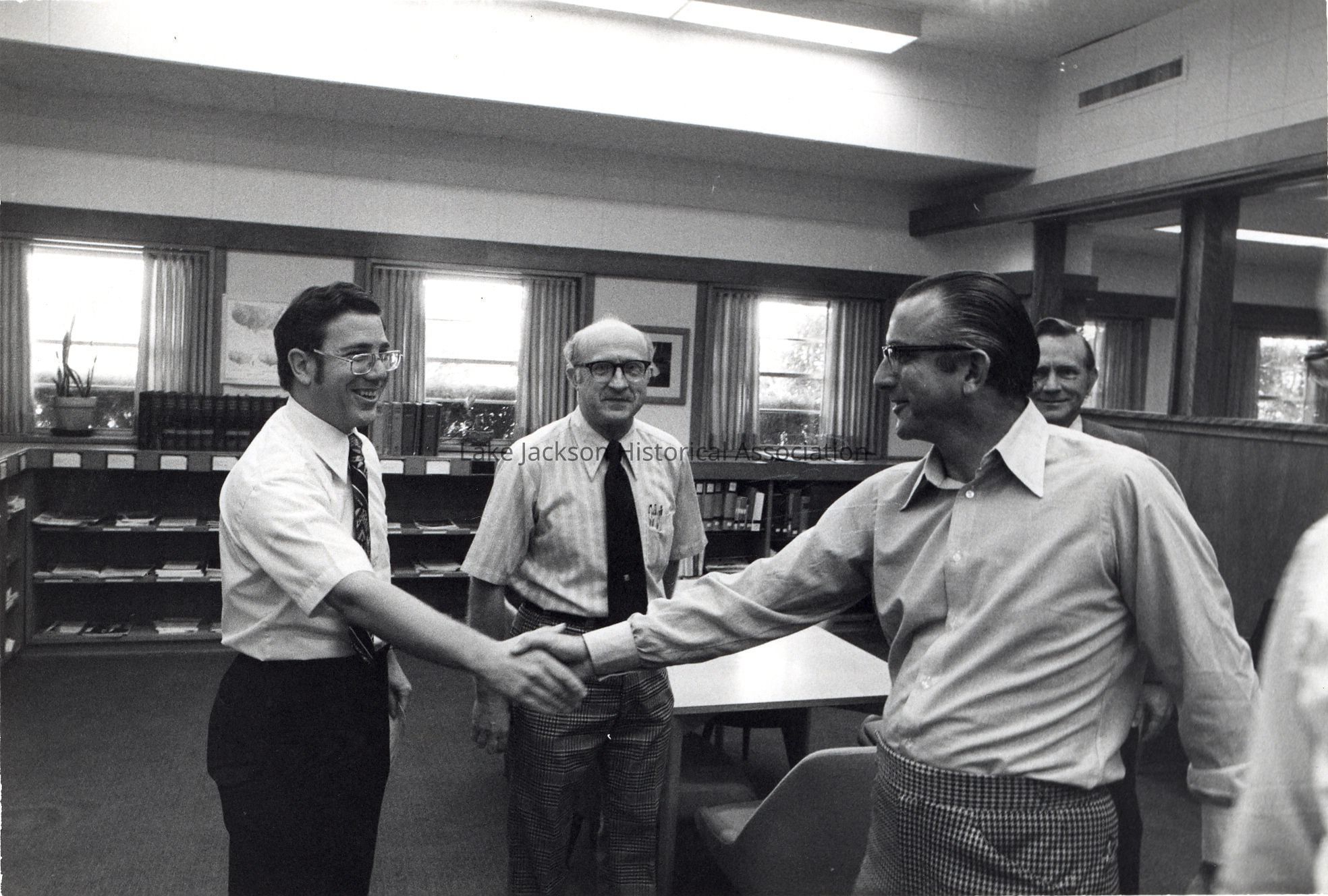 Black and white photo of President Paul Oreffice shaking hands with an employee while touring the Propylene Oxide plant at Dow.Collection
