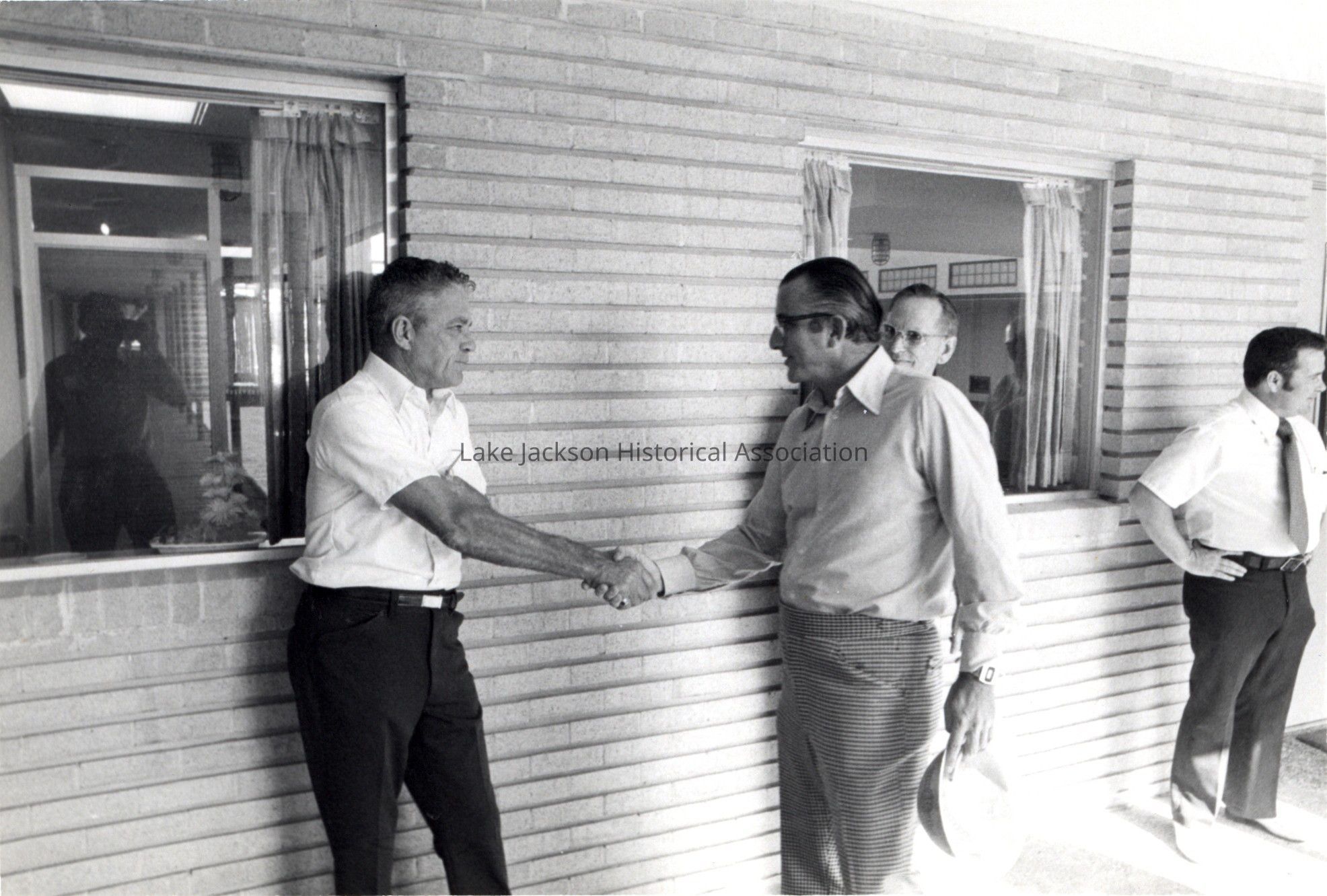 Black and white photo of President Paul Oreffice shaking hands with an employee while touring the Propylene Oxide plant at Dow.Collection