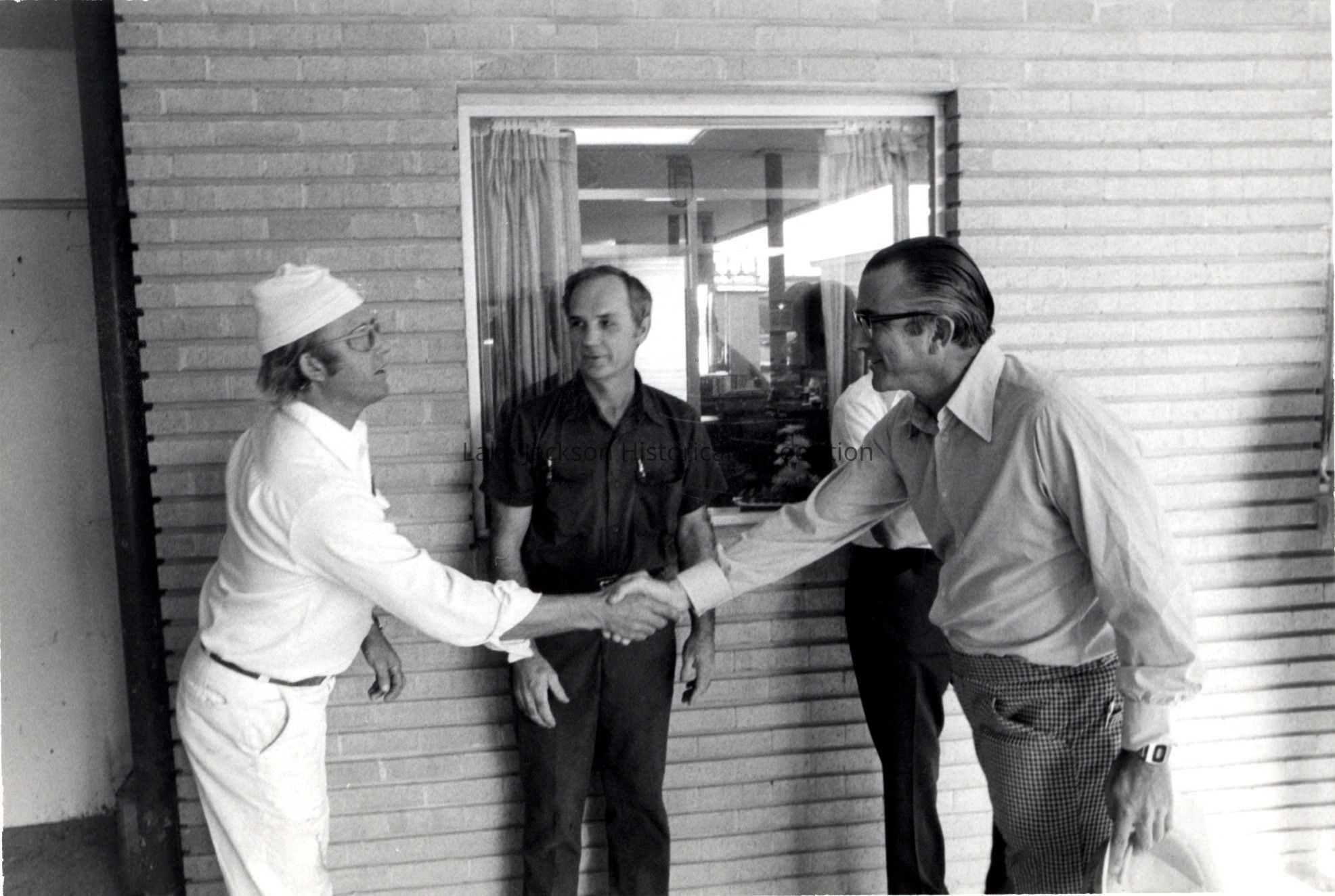 Black and white photo of President Paul Oreffice shaking hands with an employee while touring the Propylene Oxide plant at Dow.Collection