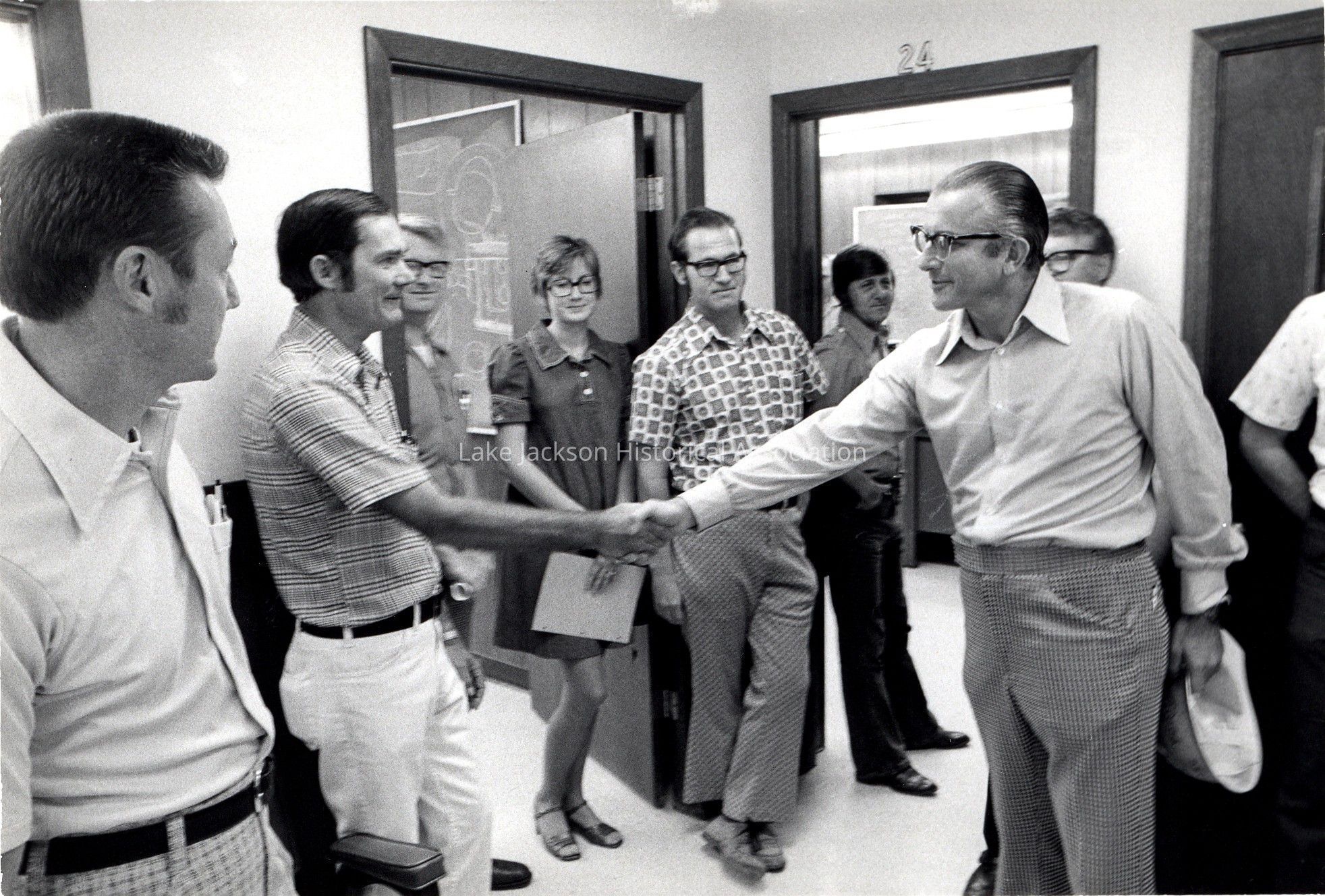 Black and white photo of President Paul Oreffice shaking hands with an employee while touring the Propylene Oxide plant at Dow.Collection