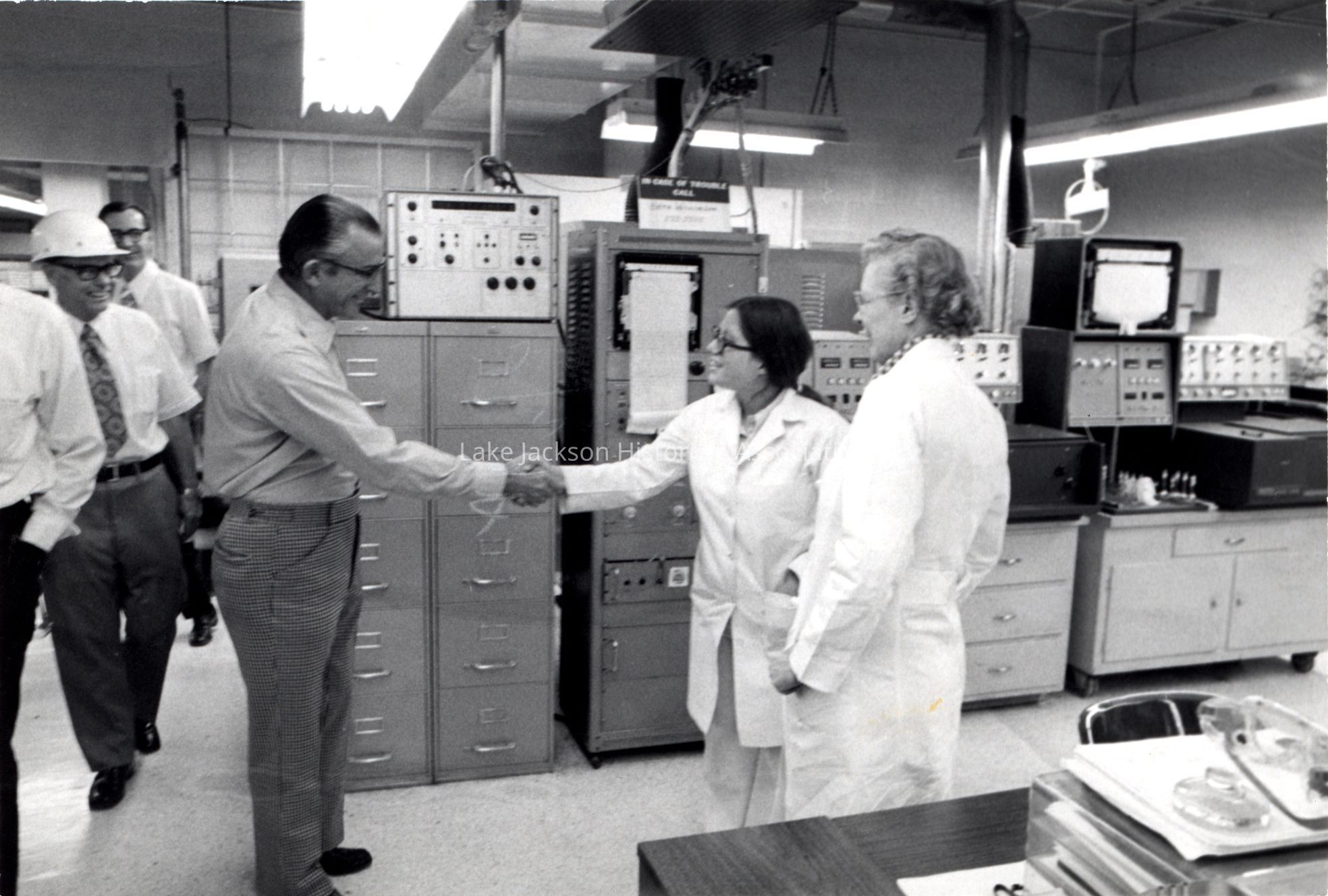 Black and white photo of President Paul Oreffice shaking hands with a woman employee in a lab while touring the Propylene Oxide plant at Dow.Collection