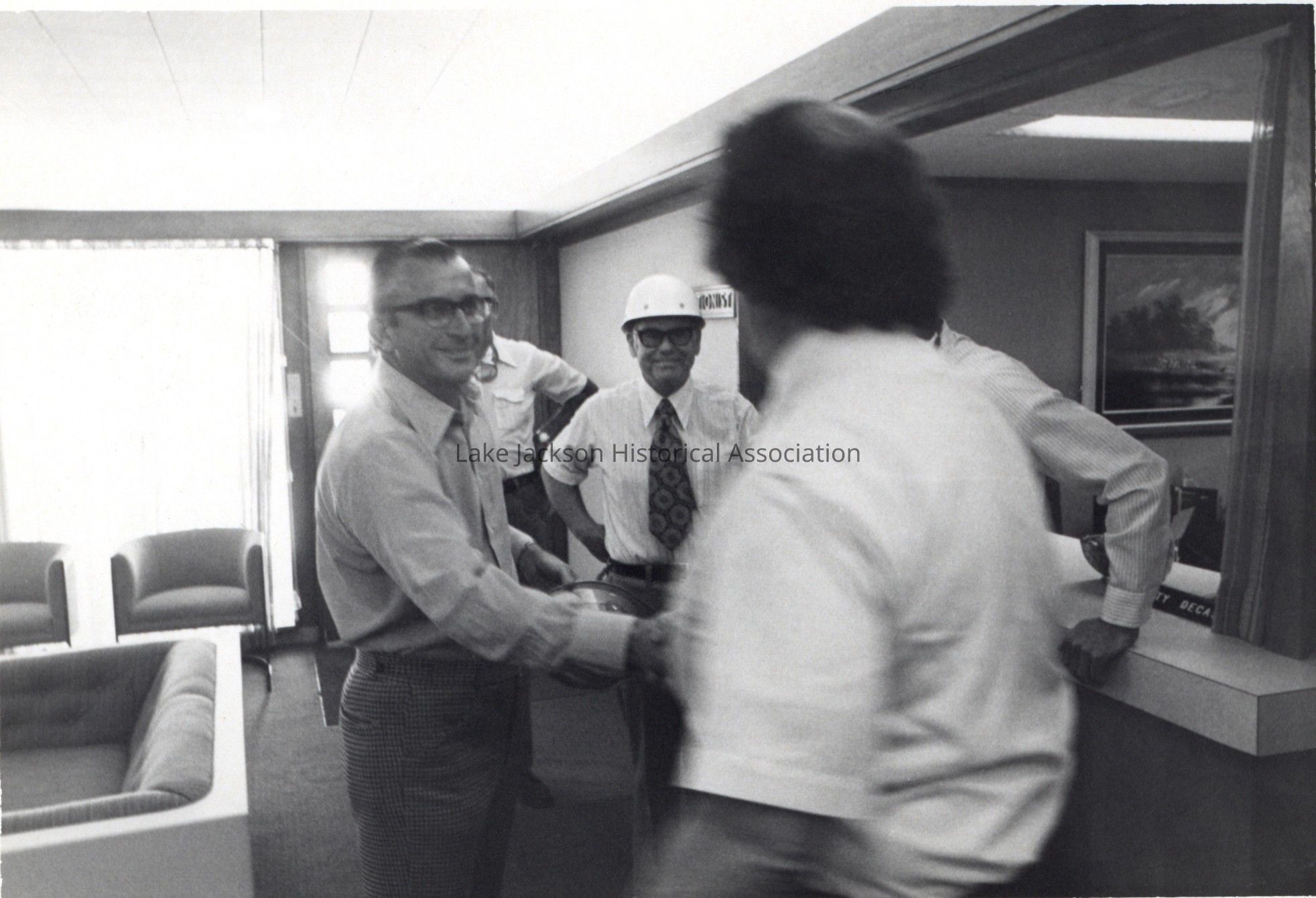 Black and white photo of President Paul Oreffice shaking hands with an employee while touring the Propylene Oxide plant at Dow.Collection