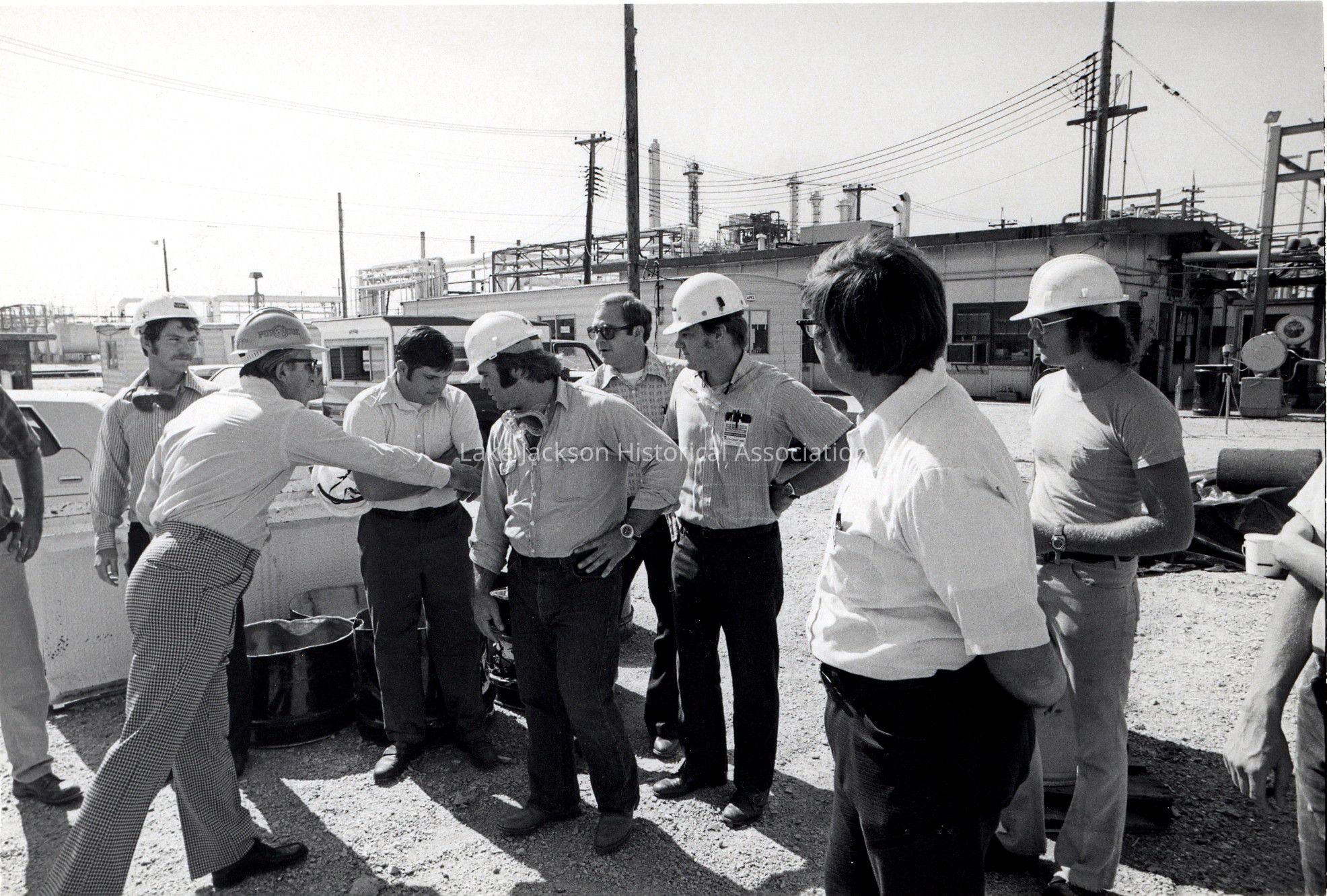 Black and white photo of President Paul Oreffice shaking hands with an employee outside on the plant grounds while touring the Propylene Oxide plant at Dow.Collection