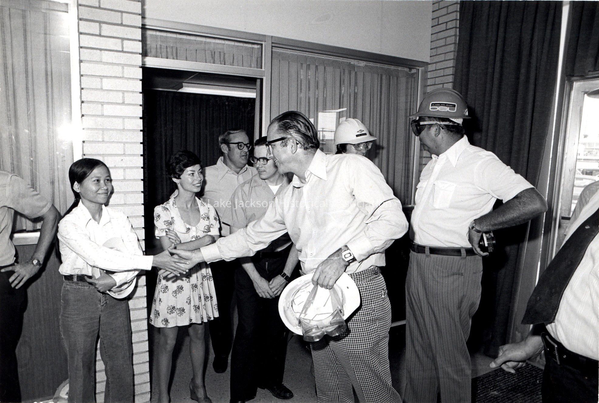 Black and white photo of President Paul Oreffice shaking hands with a woman employee while touring the Propylene Oxide plant at Dow.Collection