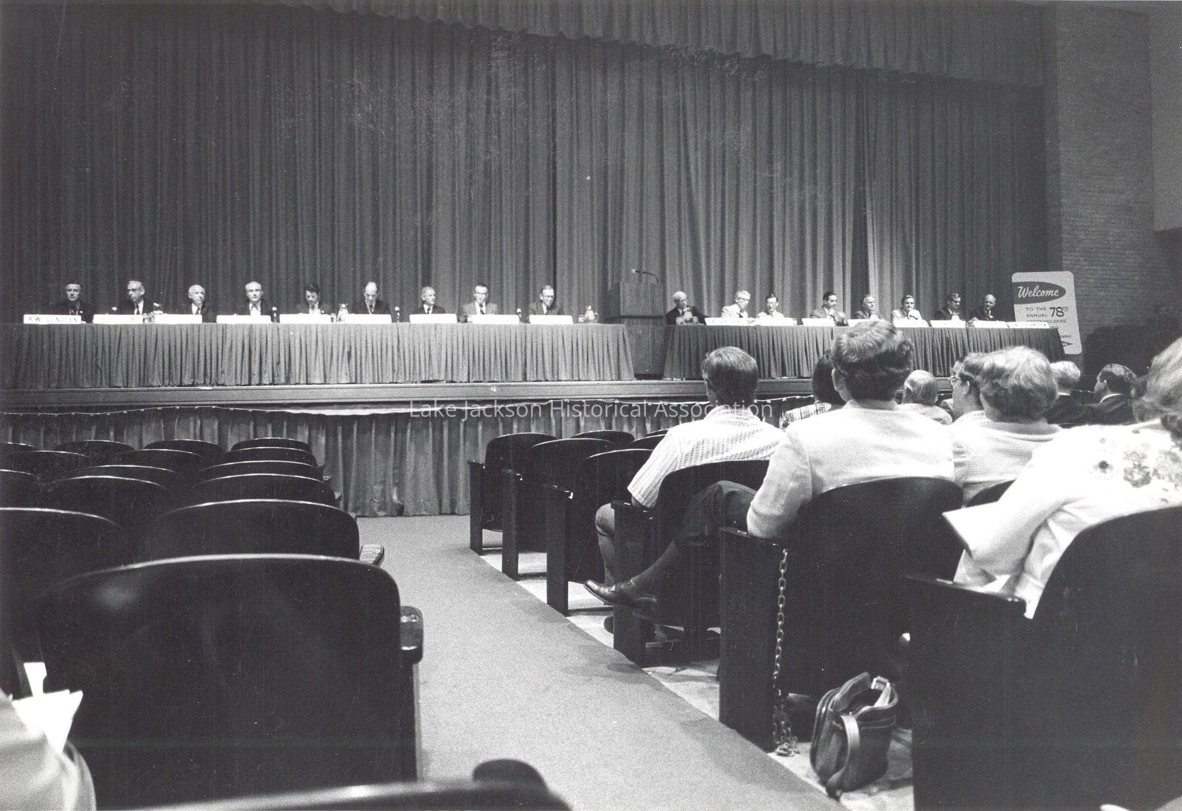 Black and white photo of the 78th annual Dow stockholders meeting. The panel of officers are seated on stage while stockholders can be seen seen seated in the audience.Collection