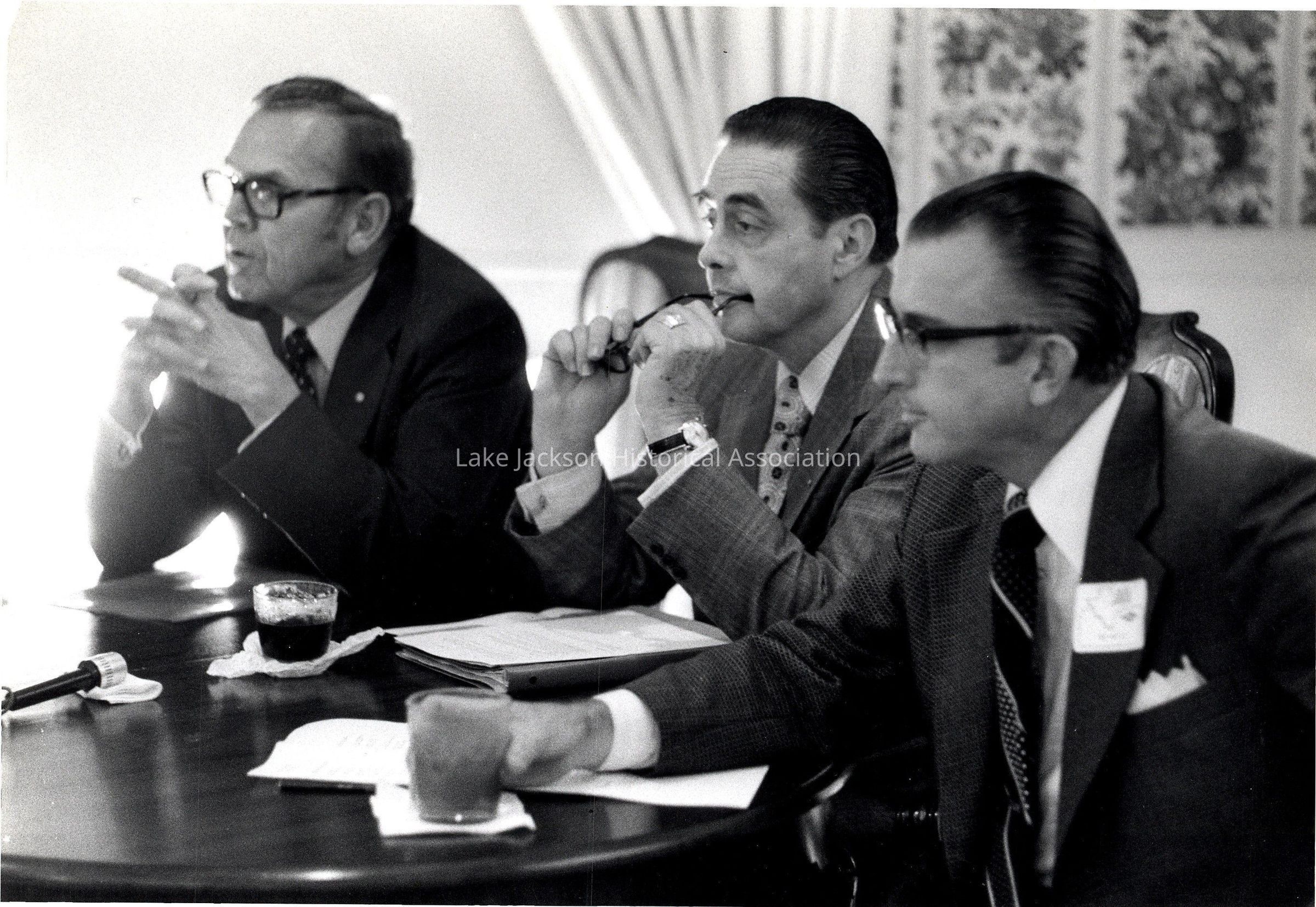 Black and white photo during the 78th annual Dow stockholders meeting. Three of the officers are shown seated at a table, President Paul Oreffice is on the left-hand side.Collection