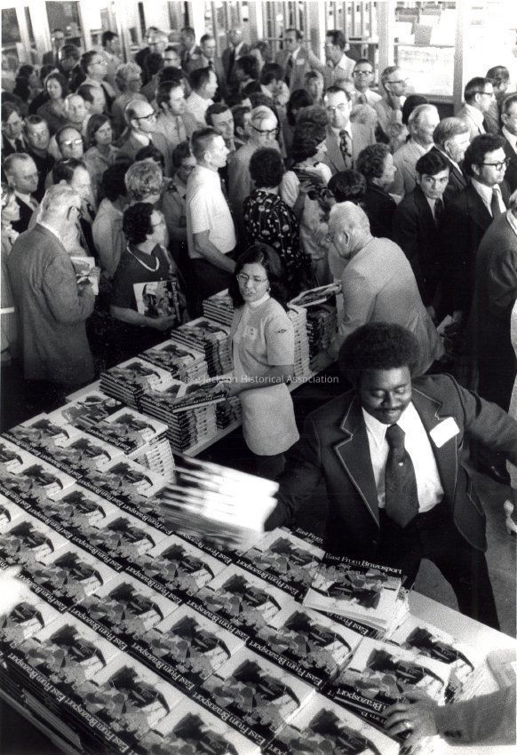 Black and white photo during the 78th annual Dow stockholders meeting. The book "East from Brazosport" is being past out to stockholders who attended the meeting. The author was there to autograph these copies.Collection
