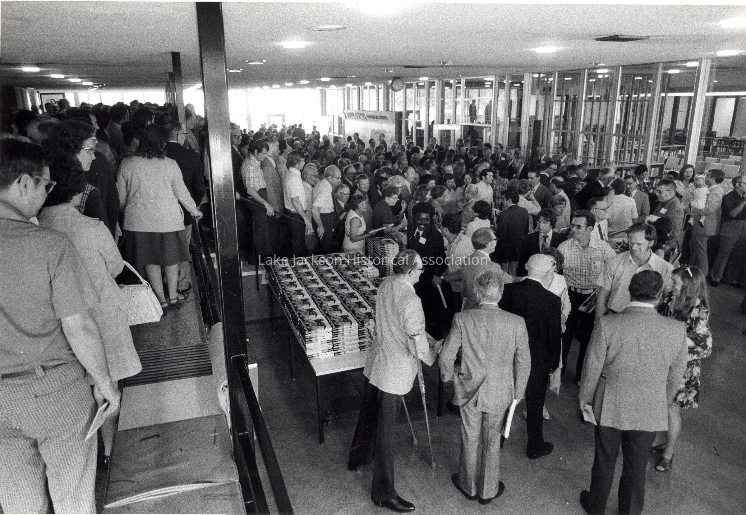 Black and white photo during the 78th annual Dow stockholders meeting. The book "East from Brazosport" is being past out to stockholders who attended the meeting. The author was there to autograph these copies.Collection