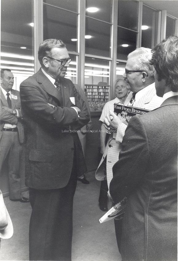 Black and white photo during the 78th annual Dow stockholders meeting. Ben Branchtalks with the author William B. Seward who wrote "East from Brazosport."Collection