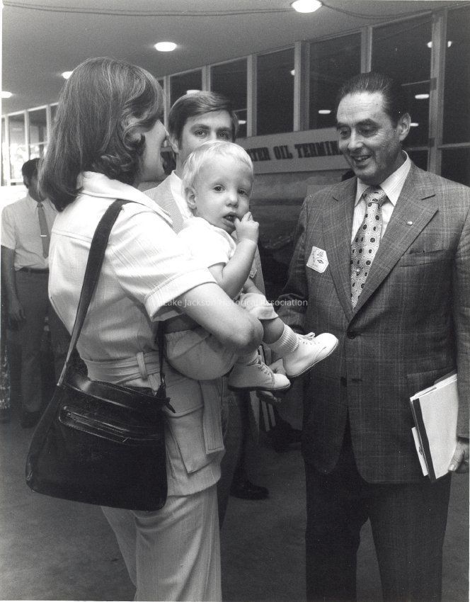 Black and white photo during the 78th annual Dow stockholders meeting. An officer talks with a family of stockholders. A mother is holding her son in her arms.Collection