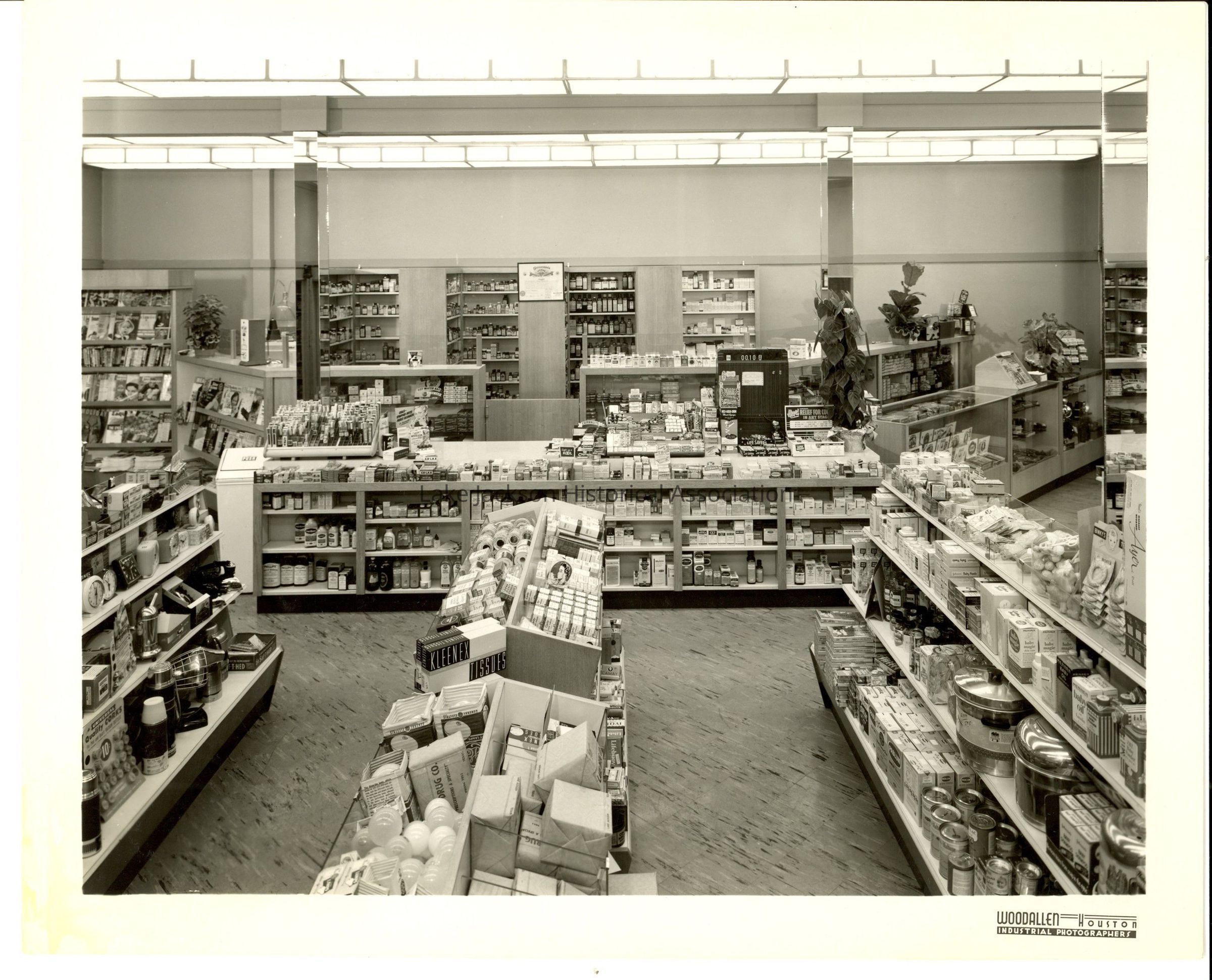 A black and white photograph of the aisles inside Lake Drug. In the foreground are three rows of shelves. Displayed on these shelves are various household items including tissues, light bulbs, clocks, and thermoses. Perpendicular to these rows is a counter with low shelves and on the shelves are over the counter medicines and to the right of the counter are boxes of cigars inside a display case and to the left of the counter are various magazines. Behind the counter is a taller display case with packs of cigarettes on top which has a swinging door for the pharmacist to move back and forth from the cash register on the counter to behind the taller display case where prescription medicine is stored. The photograph has a white border and on the border in the bottom right corner is "Woodallen Industrial Photograpehers Houston". Stamped on the back is "Woodallen/ Industrial Photographers/ 3505 Louisiana Phone JUstin 4698/ Houston 6, Texas/ Neg. No. JC 55-2" and next to the photographers name is the logo for the Professional Photographers Guild of Houston.Collection