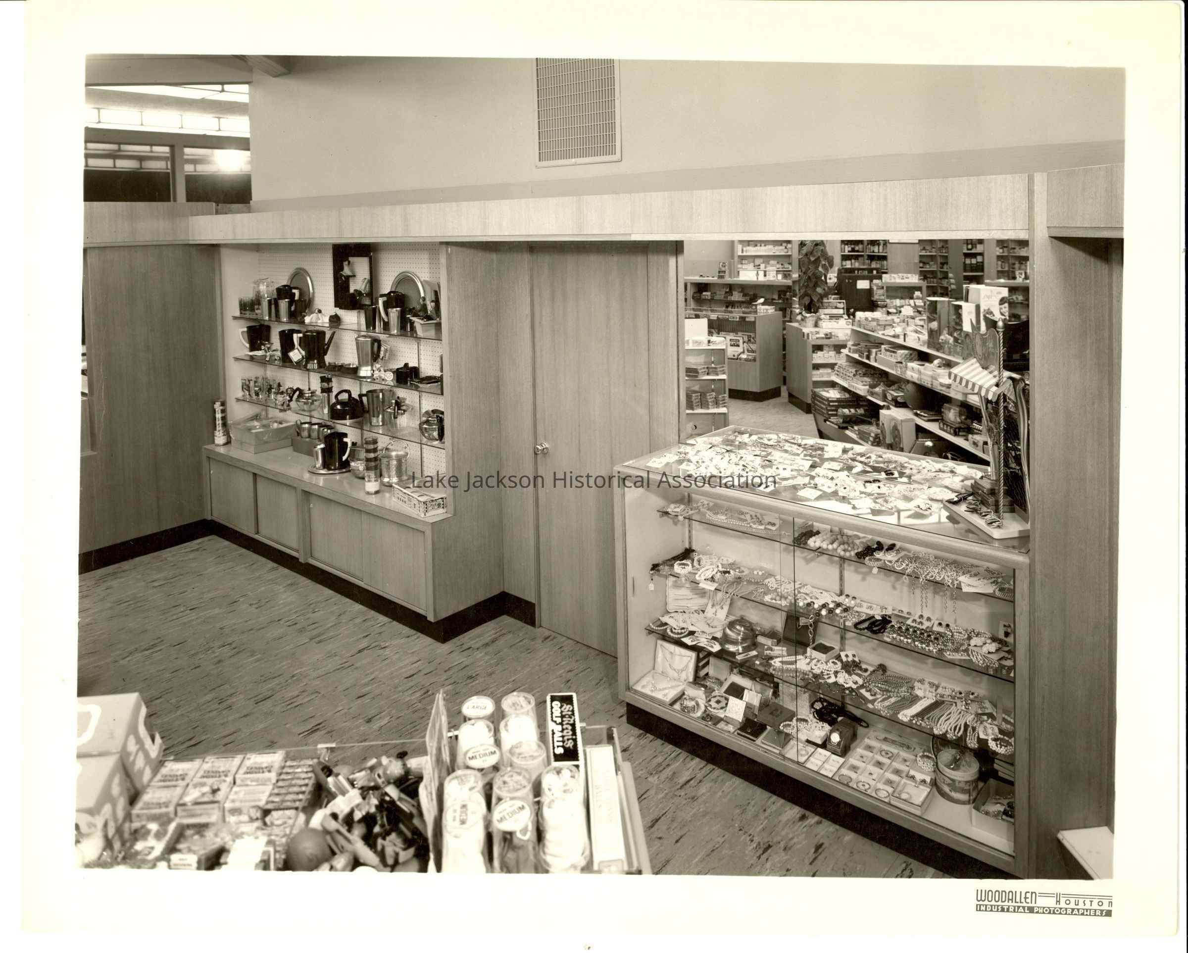 A black and white photograph of the aisles inside Lake Drug. The photograph shows one of the walls. In the center of the wall in the photograph is a door, to the left side of the door are glass shelves displaying household items such as coffee pots and to the right side of the door is a locked display cabinet with jewelry inside and some on the top of the case. At the bottom of the photograph is a display shelf with boxes of golf balls and table tennis balls as well as household items. The photograph has a white border around it and on the border in the bottom right corner is "Woodallen Industrial Photographers Houston". Stamped on the back is "Woodallen/ Industrial Photographers/ 3505 Louisiana Phone Justin 4698/ Houston 6, Texas/ Neg. No. JC 55-3" next to the photographers name is the logo for the Professional Photographers Guild of Houston.Collection