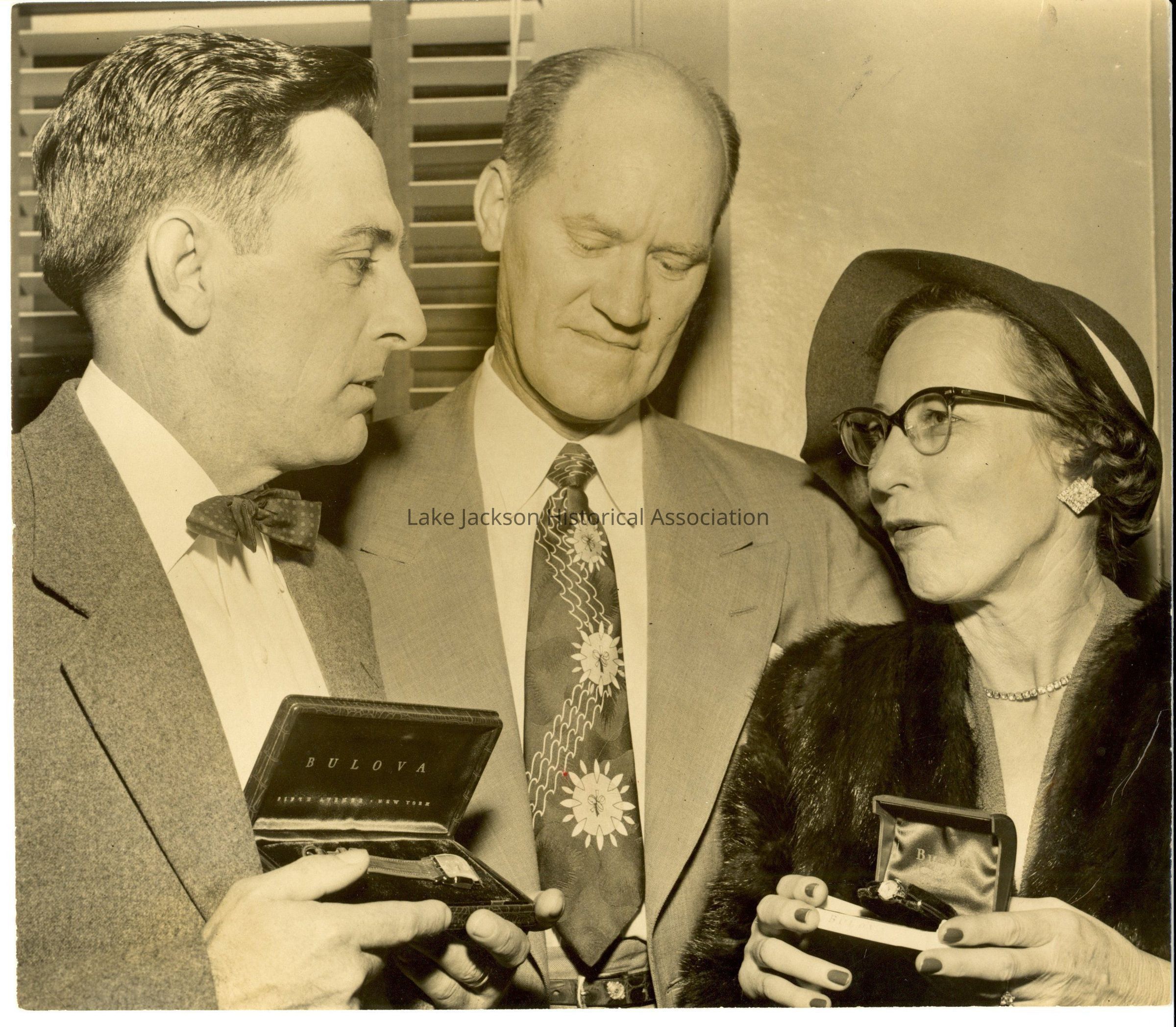 Black and white photograph of Bob Franklin, Homer Beakley, and a lady. Bob Franklin and the lady are holding men's and women's Bulova watches.Collection