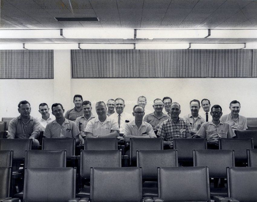 Black and white photograph showing three rows of men in a room with chairs. Left of center at the top is a spot where a paper clip had been attached.