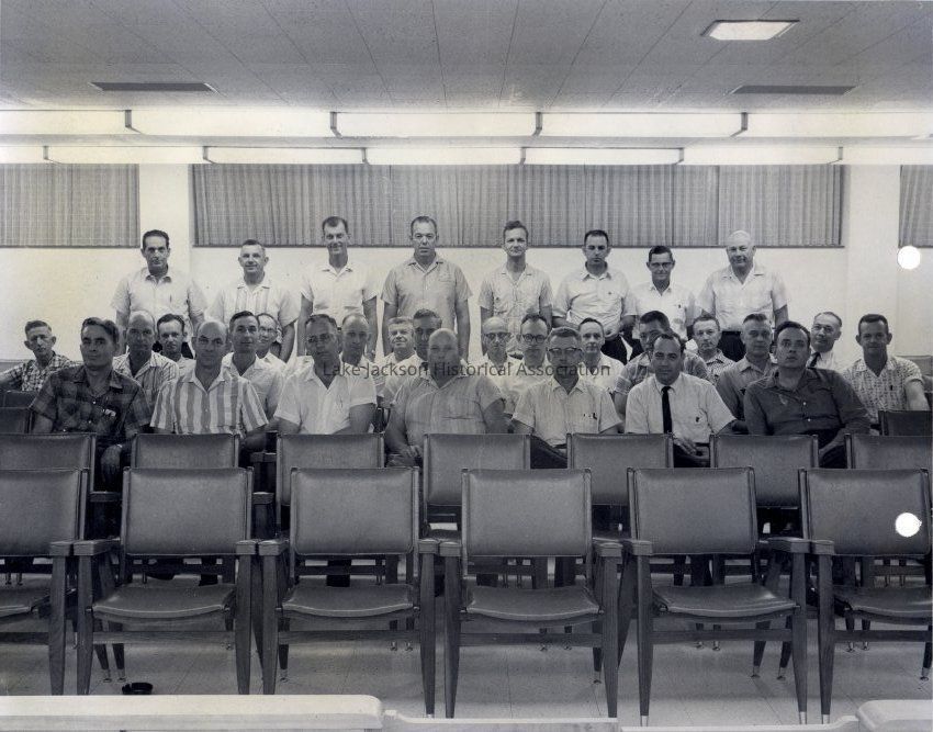 Back of photograph has a paper label (7.75 x 10.0 inches) attached to it. The paper has the photograph title (see above) and identifies the employees in the photograph. Front Row: J. Carson Smith, L.L. Schroeder, L.W. Monroe, J.C. Smith, E.L. Carlson, J.R. Hickey, G.B. Harding, Jr. Second Row: J.M. Andrews, C.W. Horak, Jr., A.M. Morris, E.W. Ahlrich, F.M. Leever, V.D. Osborn, A.W. Dauer, J.M. Stephens. Third Row: W.A. Moncrief, A.W. Henson, R.L. Allman, J.A. Arnt, T.N. Cooksey, R.E. Lewis, R.O. Brown, A.N. Earle, S.R. Thompson. Fourth Row: C.R. Allen, S.L. Valigura, Jr., W.T. Barthelemess, C.L. Murray, R.D. Magouirk, D.L. Spell, A.A. Wilson, A.J. Ehlert.