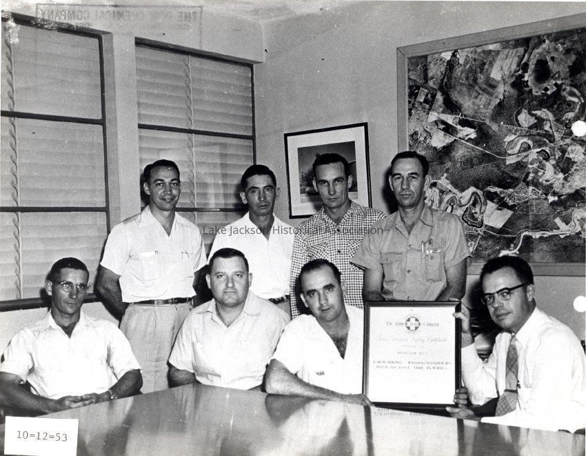 Black and white photograph of 8 men around a table with a safety award. Four men are seated and four a standing.
