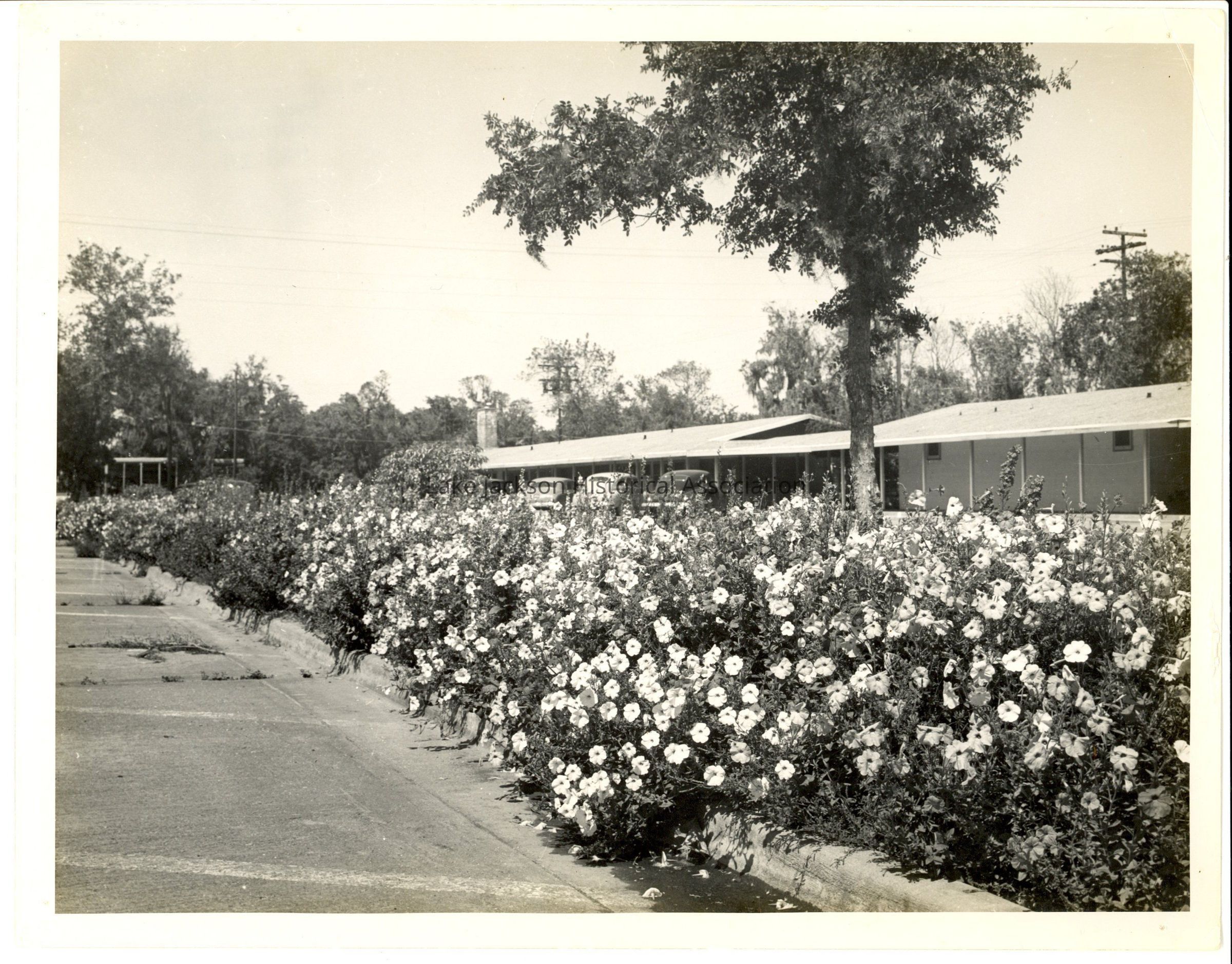 A black and white photograph of Alden Dow's office in the back center of the photo with cars parking in the front of the office. The median, in the center of the parking lot, is in the foreground showing the landscaping with flowers and a tall tree.Collection