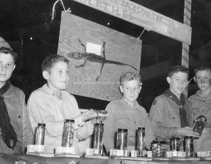 Black and white photograph copy of the First Scout Troop in Lake Jackson, which was taken at a scout circus in Galveston sometime in 1946 or 1947. The scout master was Mr. Raymond Walley.