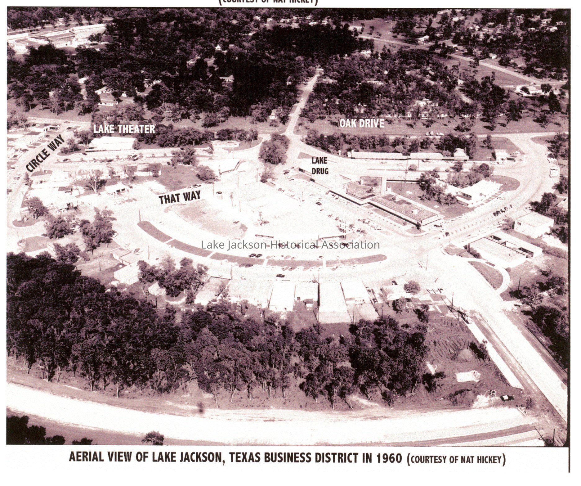 Black and white photo copy of aerial view of the city of Lake Jackson, TEXAS business district in 1960.