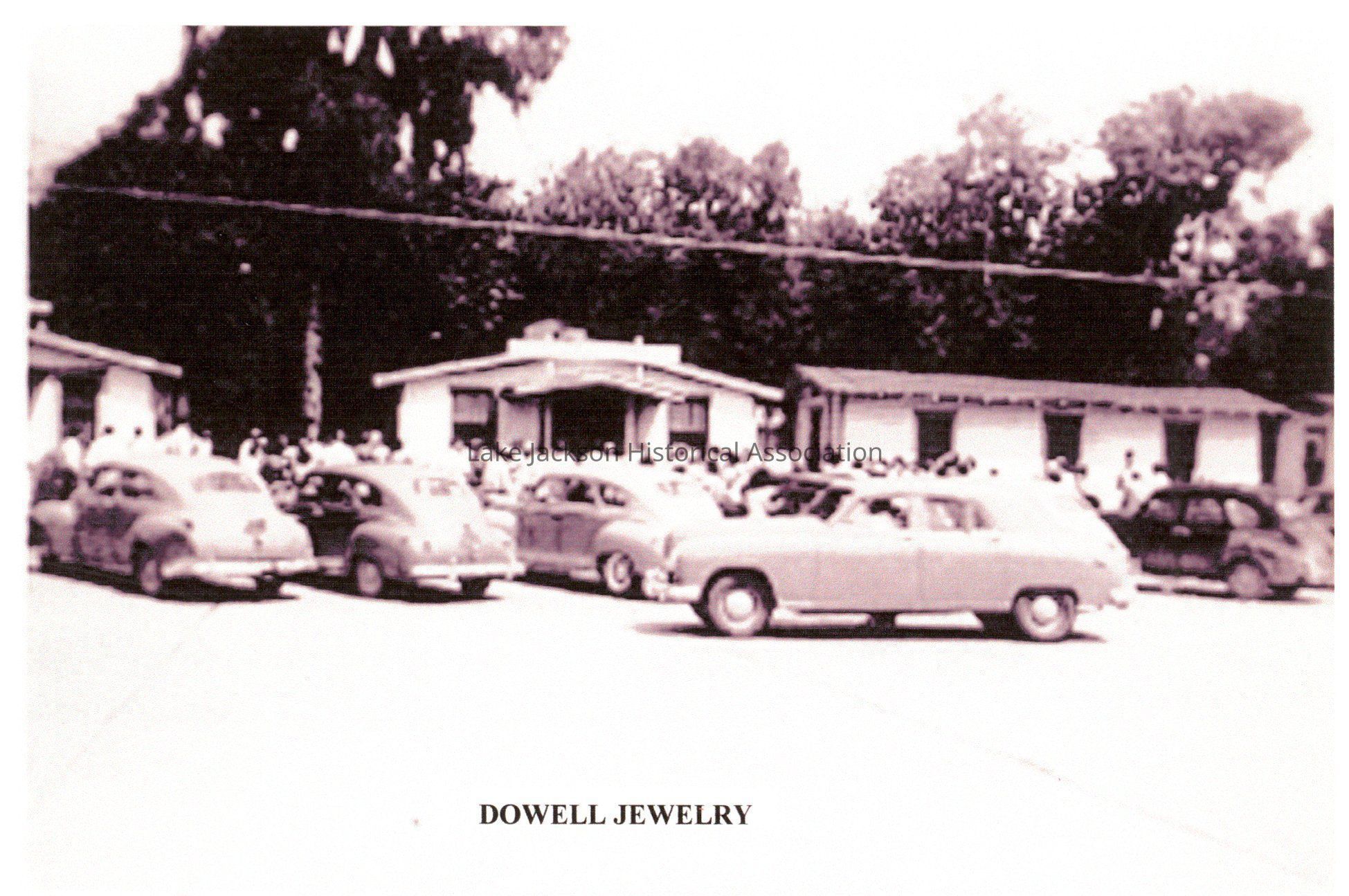 Black and white photo copy of Dowell Jewelry . There were cars before the building.