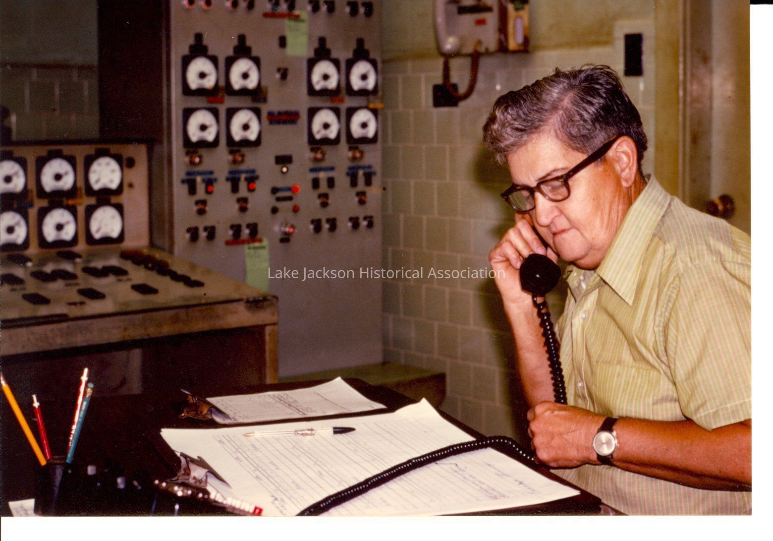Color photograph of L.G. Lewis Conner, 1971. Name and date are from a handprinted label on the page. He is on the telephone.