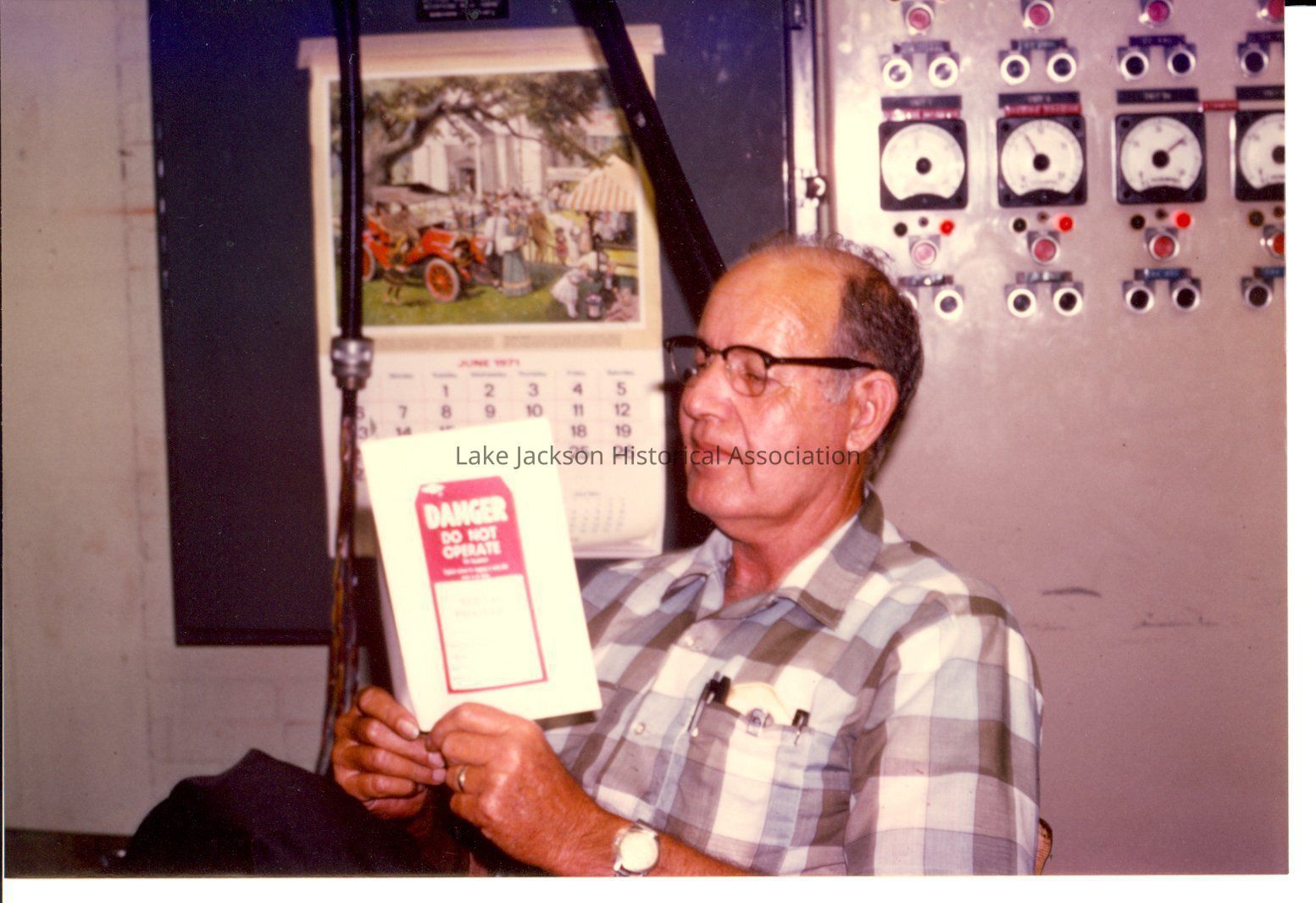 Color photograph of T.E. Truman Cox, 1971. Name and date are from a handprinted label on the page. He is reading a Red Tag safety manual.