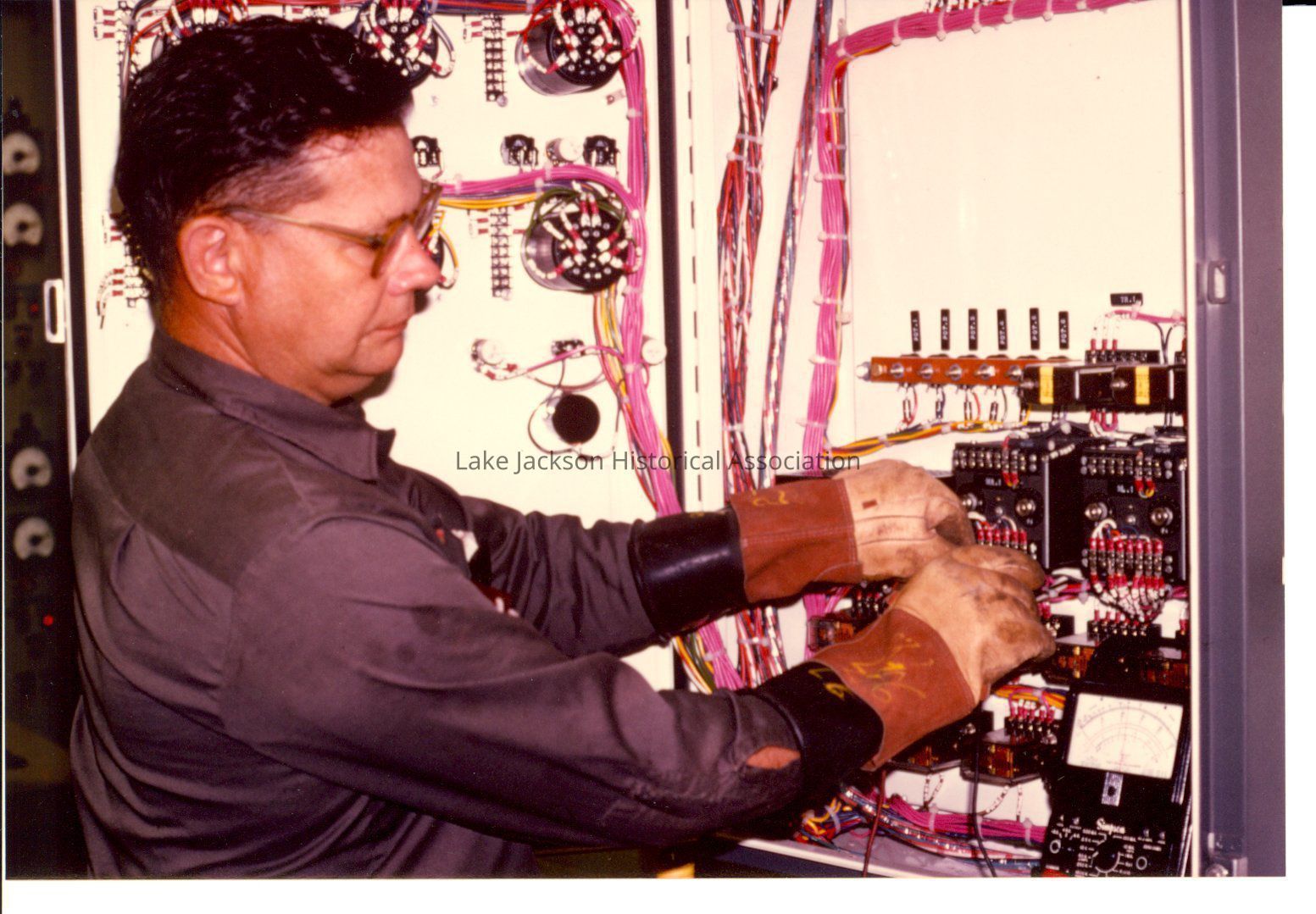 Color photograph of E.O Earl Dilocker, 1971. Name and date are from a handprinted label on the page. He is wearing gloves and adjusting a wiring panel..
