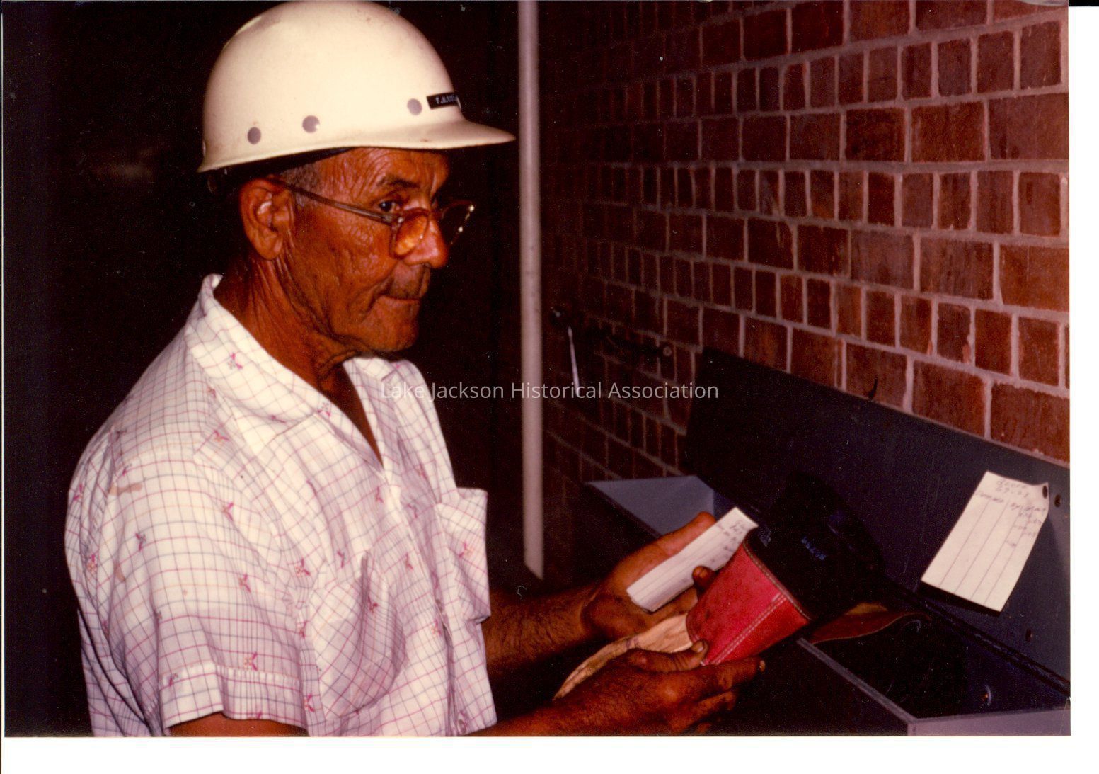 Color photograph of F.H. Frank Mancuso, 1971. Name and date are from a handprinted label on the page. He is inspecting a pair of gloves.