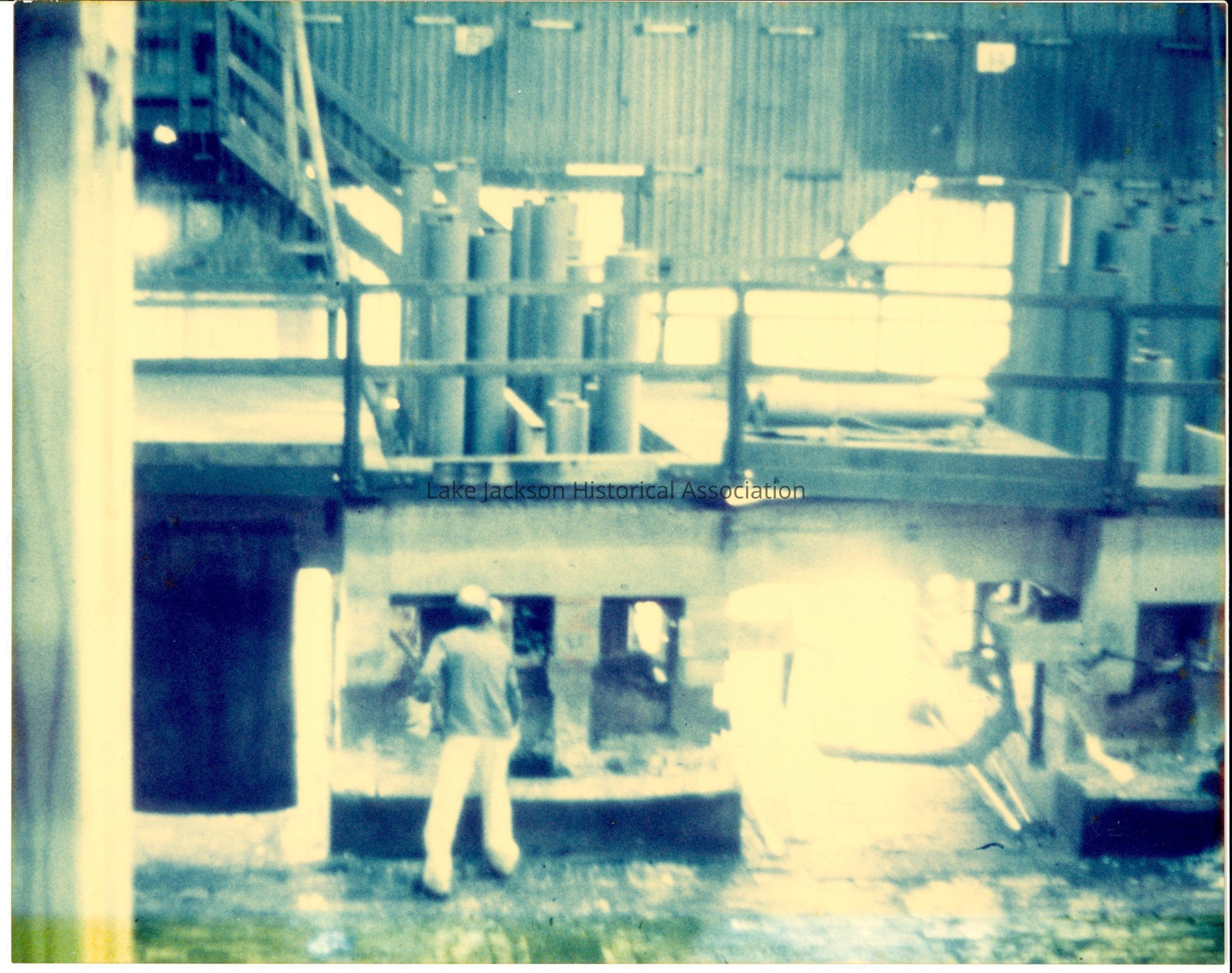 Photograph of operator in front of electrolytic cell at Mag Chlor I in the 1970s.