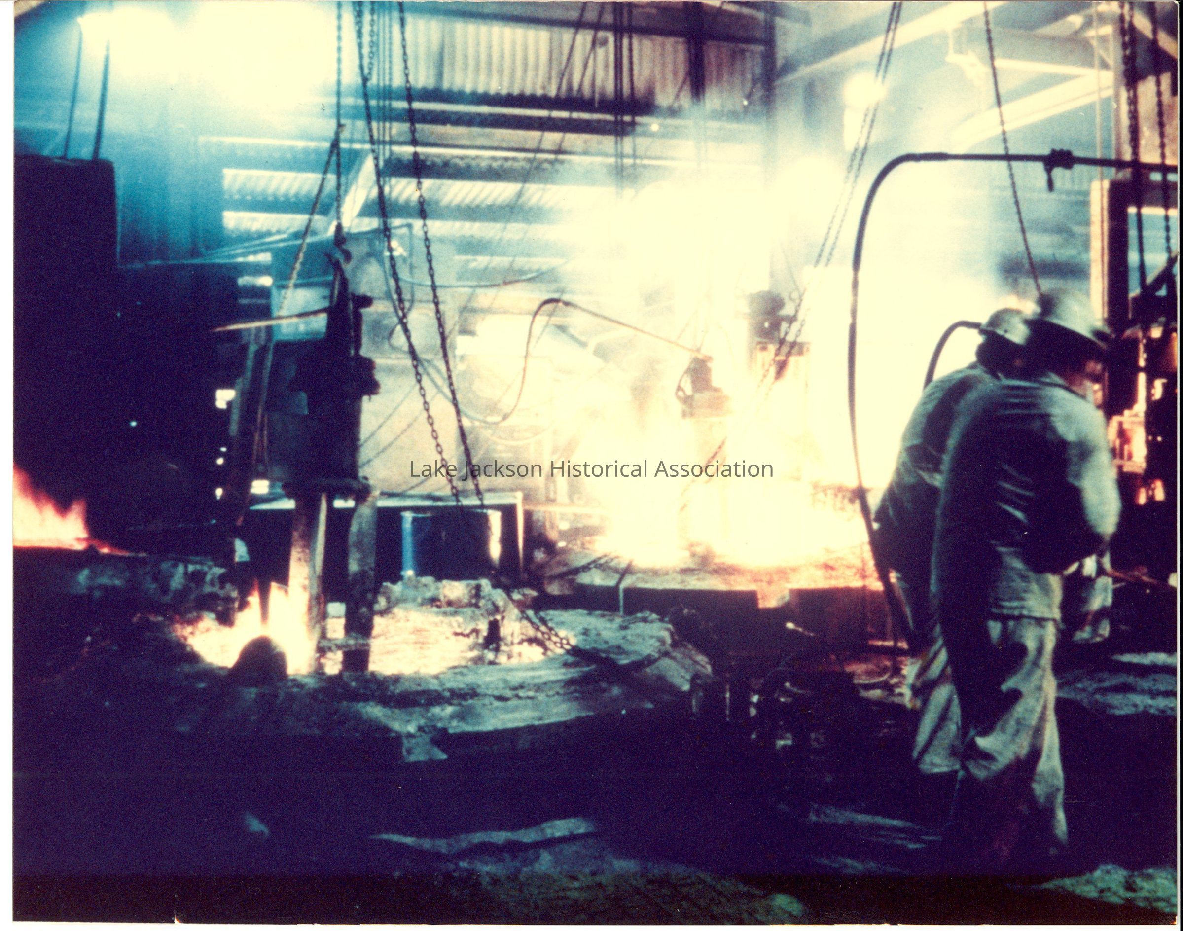 Photograph of operators in front of alloy pot at Mag Casting A in the 1980s.