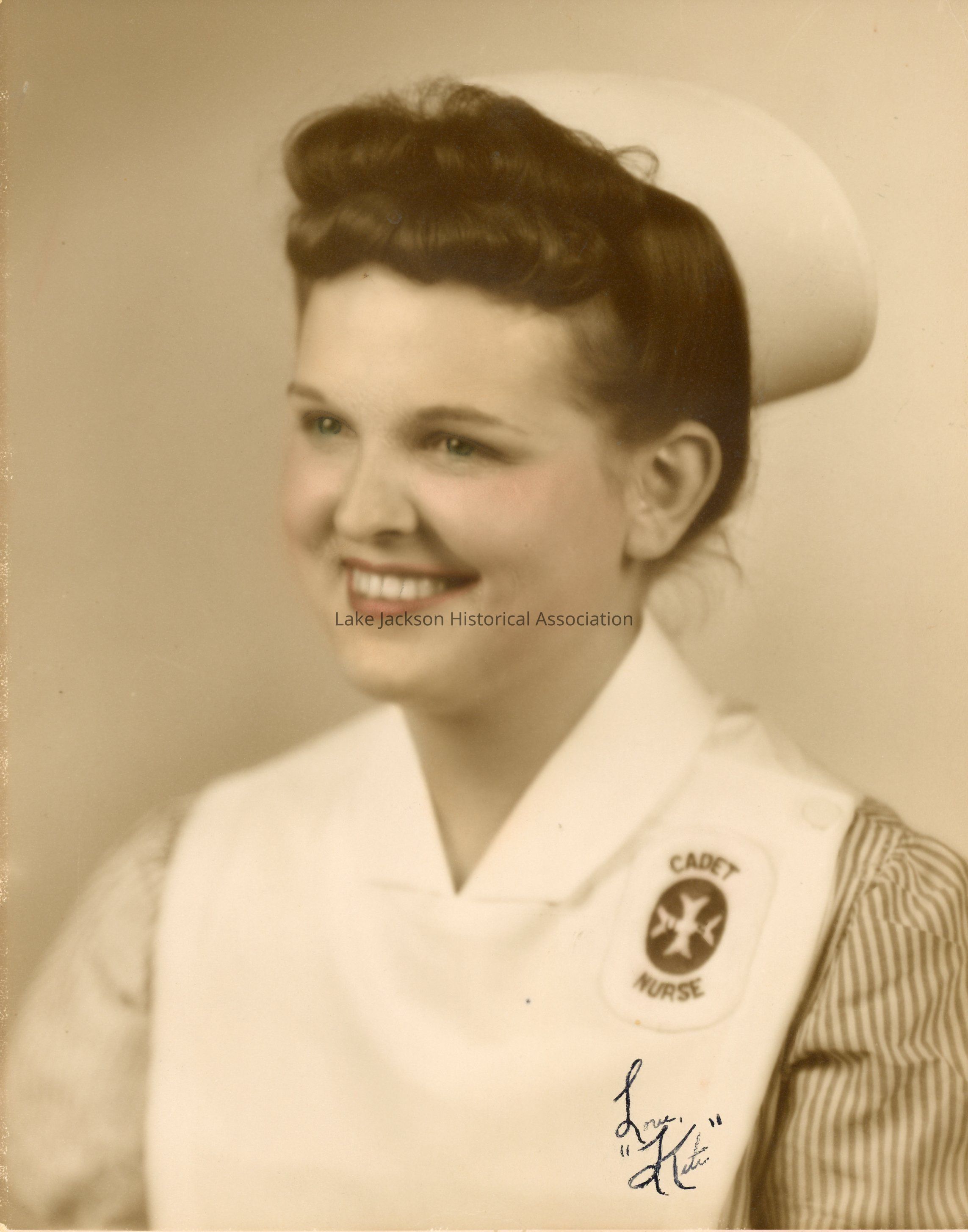 Color enhanced photo of Stella Kay Alcott in cadet nurse uniform, striped dress covered by a white apron and Cadet Nurse patch on front, traditional nurse hat. Signed Love "Kite".
